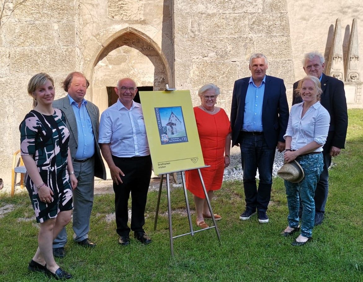 Präsentation vor der Fischerkirche am 4. Juni 2021: Patricia Liebermann BA MD (Leitung Produktmanagement Philatelie), Mag. Wilhelm Remes (Obmann Österr. Philatelistenverein St. Gabriel), Pfarrer Msgr. Mag. Dr. Johannes Salzl, Dr. Susanna Steiger-Moser, Mag. Gerold Stagl (Bürgermeister Rust), Dipl. Graph. Kirsten Lubach, Ing. Alfred Kunz (Stv. Präsident VÖPh)