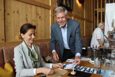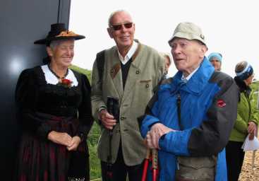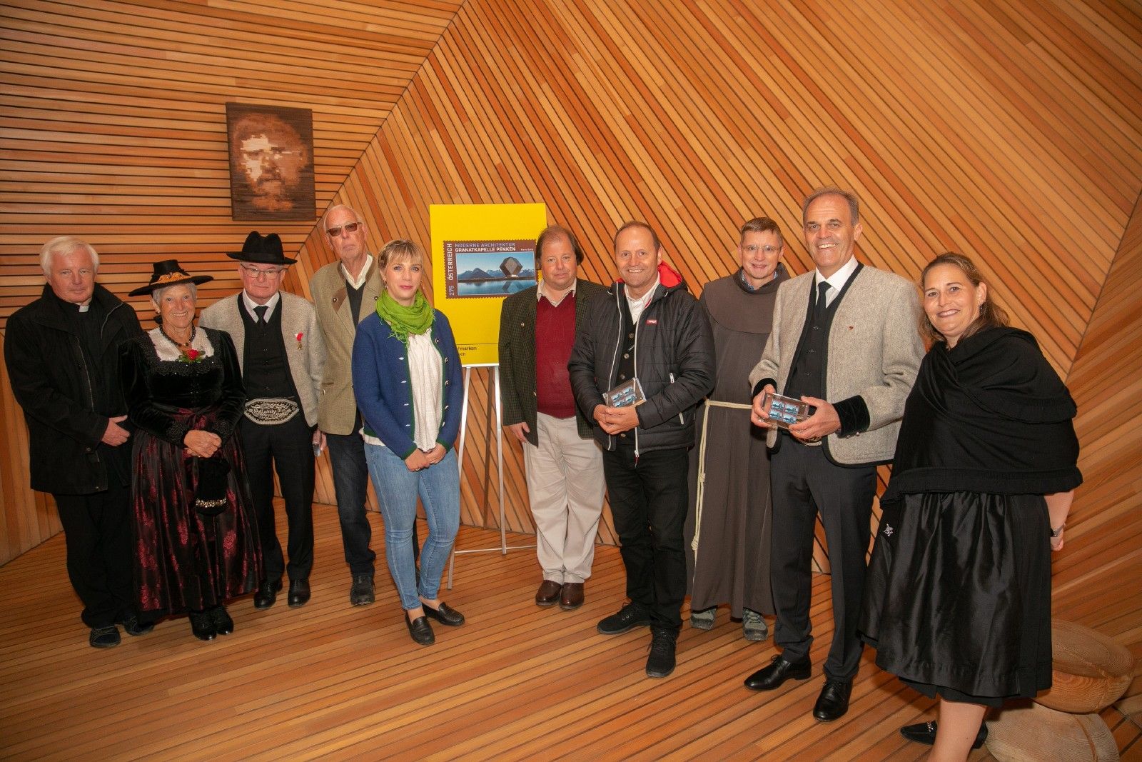 Dekan Ignaz Steinwender, Martha und Josef Brindlinger, Ehrenobmann Dr. Ohnmacht, Patricia Liebermann BA MDes (Produktmanagement Philatelie, österr. Post AG), Obmann Mag. Wilhelm Remes (Gilde St. Gabriel), LH-Stellvert. Tirol ÖR Josef Geisler, Br. Pascal Hollaus ofm, Andreas Kröll (Bgm. Finkenberg) und Martina Prinz (Verkaufsleitung Philatelie)