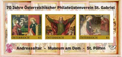 Aus diesem Anlass nimmt die Gilde St. Gabriel an der philatelistischen Großveranstaltung anlässlich des 100-jährigen Bestehens des VÖPh in St. Pölten teil (24.-26. September 2021) und legt einen ME 3 (Marken-Edition 3 mit den Motiven Mariä Verkündigung, Hl. Andreas, Christi Geburt) und einen von Peter Sinawehl gestalteten Sonderstempel mit dem Motiv Mariä Verkündigung auf. Die Motive entstammen dem Andreasaltar, der um 1470 vom nordungarischen Meister Hans Siebenbürger geschaffen wurde und sich einst in der 1786 abgebrochenen Andreaskapelle am Friedhof an der Stiftskirche (heute Domplatz / St. Pölten) befand. 1997 gelangte der Altar in den Besitz der Diözese St. Pölten und zählt seitdem zum Bestand des Museums am Dom in St. Pölten.