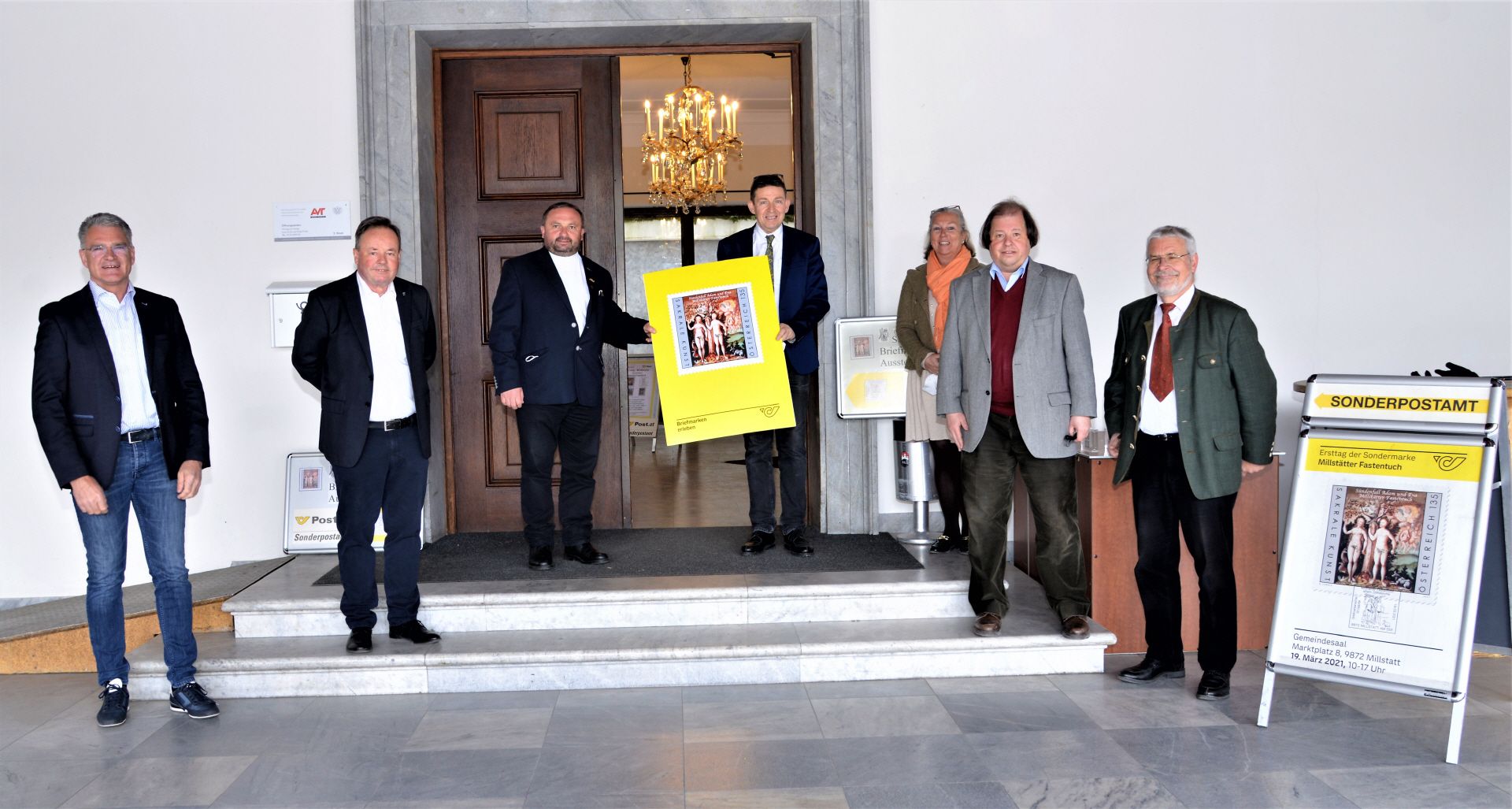 Dank der Marktgemeinde Millstatt – die uns im Kongresshaus einen großen Saal zur Verfügung gestellt hatte – und der Pfarre Millstatt konnte der Ersttag des 21. Wertes der Reihe Sakrale Kunst zumindest mit der Öffnung des Sonderpostamtes stattfinden. Auch Hans Soriat war vor Ort und bot das philatelistische Belegprogramm an, das in Windeseile vergriffen war. Im Ort hangen überall unsere Plakate, die ein temporäres Postamt ankündigten. Es waren verständlicherweise nahezu die Einzigen auf den Litfaßsäulen. Daraus resultierte der gute Besuch des Sonderpostamtes. Vor dem Kongresshaus konnte für ein Pressefoto Aufstellung genommen werden. Am Sonntag konnte Obmann Mag. Wilhelm Remes im Rahmen der hl. Messe die Marke unmittelbar vor dem „Motivspender“ – dem Millstätter Fastentuch – präsentieren. Besonders erfreulich war danach die Zusammenkunft der Kärntner Gabis für ein Photo – quasi ein Lebenszeichen der Gilde in den so schwierigen Zeiten! Am 24. März konnte unsere GS Elisabeth Plank dem Bischof der Diözese Gurk-Klagenfurt - Dr. Josef Merkatz - Ersttagsbelege überreichen!