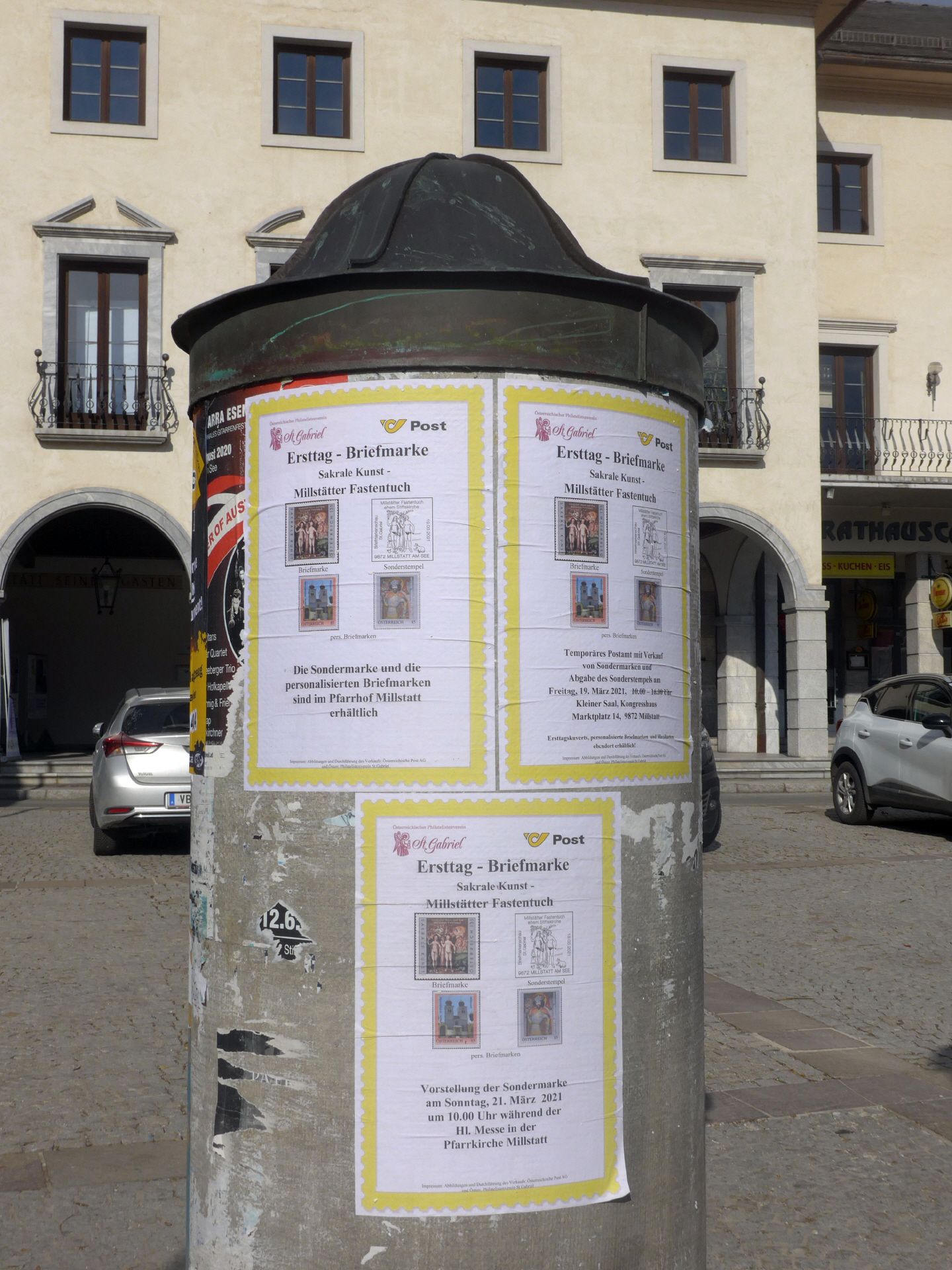 Die durch das Corona-Regime verhängten Verbote verunmöglichen das dreitägige Gildeprogramm in Millstatt. Einzig das Sonderpostamt wird am 19. März 2021 von 10-16 Uhr im Gemeindeamt Millstatt (Marktplatz 8) gemäß der derzeitigen Umstände durchgeführt werden können. Ebenso wird dort Hans Soriat mit dem Belegprogramm anwesend sein, der neben FDC und Maxikarten auch zwei personalisierte Briefmarken auflegt: Die erste Marke zeigt die Westansicht der ehem. Stiftskirche mit ihren romanischen Türmen und barocken Zwiebelhelmen. Die zweite Marke zeigt das Epitaph des hl. Domitian mit Herzogshut und Lehensfahne in der gleichnamigen Kapelle der Stiftskirche. Der hl. Domitian – ein Karantaner Herzog - wird gemäß der Legende als Gründer der ersten Millstätter Kirche bzw. als Vernichter der 1000 Götzensäulen zu Millstatt verehrt.