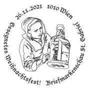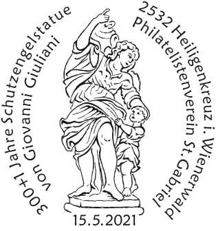 Samstag, 15. Mai 2021, Stift Heiligenkreuz (PLZ: 2532), Pilgeraula (im Stifts-Innenhof): Sonderpostamt von 12 bis 16 Uhr geöffnet, Anlass: 300+1 Jahre Schutzengelstatue, Sonderstempel v. Maria Schulz und PBM (personalisierte Marke) zeigen den Schutzengel nahe Stift Heiligenkreuz (Badener Straße).