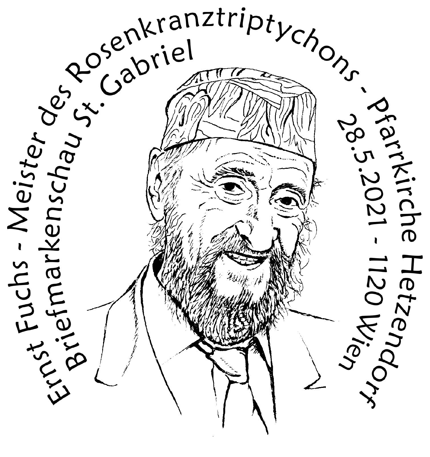 Am 28. Mai 2021 wurde nun das für Mai 2020 anlässlich der Langen Nacht der Kirchen vorgesehene Sonderpostamt im Pfarrsaal nahe der Rosenkranzkirche (Pfarre Wien-Hetzendorf) durchgeführt. Das Motiv des Sonderstempels zeigte ein Porträt des 2015 verstorebenen Meisters Ernst Fuchs, der für die Pfarrkirche Hetzendorf das Rosenkranztriptychon geschaffen hatte. Leider war an diesem Abend das Sonderpostamt das einzige zugängliche Programmelement der für diesen Abend geplanten Langen Nacht der Kirchen, da sich die Pfarre drei Wochen zuvor entschieden hatte, die Kirche zu sperren und die Darbietungen in der Kirche nur virtuell mit Video-Streaming stattfinden zu lassen. Dennoch besuchten uns viele unserer Gildemitglieder, darunter auch GS Maria Schulz, deren für dieses Postamt erstellte Sonderstempel sich als der Letzte ihrer graphischen Laufbahn erweisen sollte.