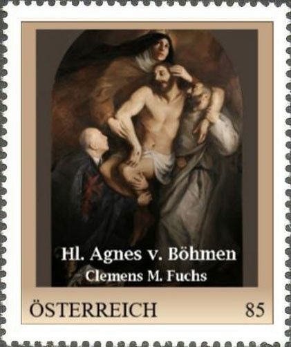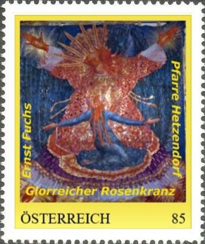 Freitag, 28. Mai 2021, Pfarrkirche Hetzendorf, Marschallplatz 6, 1120 Wien: Sonderpostamt geöffnet von 16 bis 20 Uhr; Anlass: „Drei Generationen der Malerfamilie Fuchs“ im Rahmen der Langen Nacht der Kirchen. Sonderstempel v. Maria Schulz: Ernst Fuchs. PBM 1: Glorreicher Rosenkranz v. Ernst Fuchs, PBM 2: Hl. Familie v. Michael Fuchs, PBM 3: Hl. Agnes v. Böhmen / Kreuzabnahme