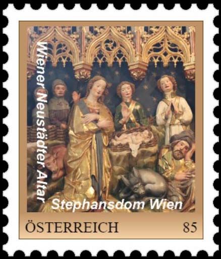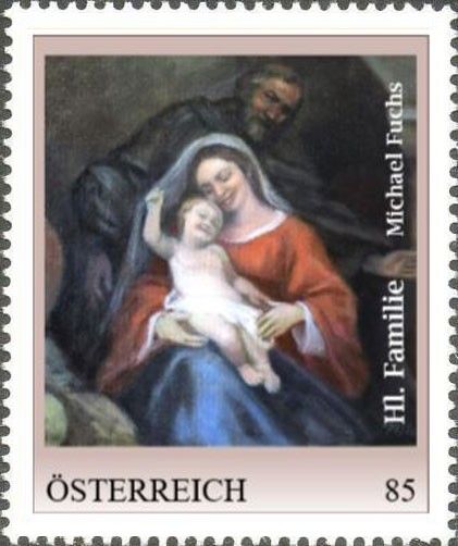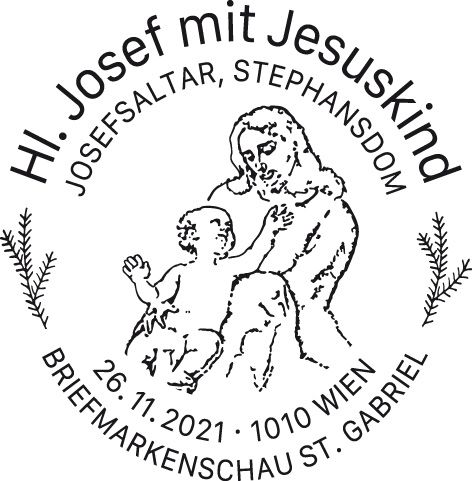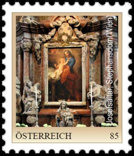 Die erste Weihnachtsmarke zeigt eine seltene Darstellung des jugendlichen Josef mit dem Jesuskind in seinen Armen nach einem Bild von Anton Schoonjans, um 1700, das sich am Josefaltar im Stephansdom befindet.