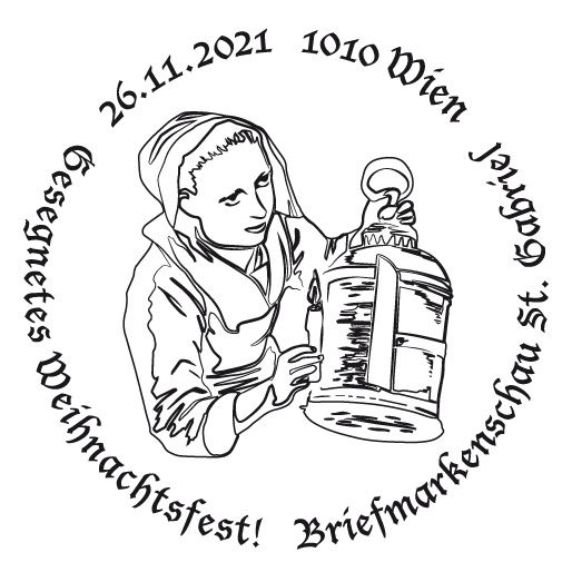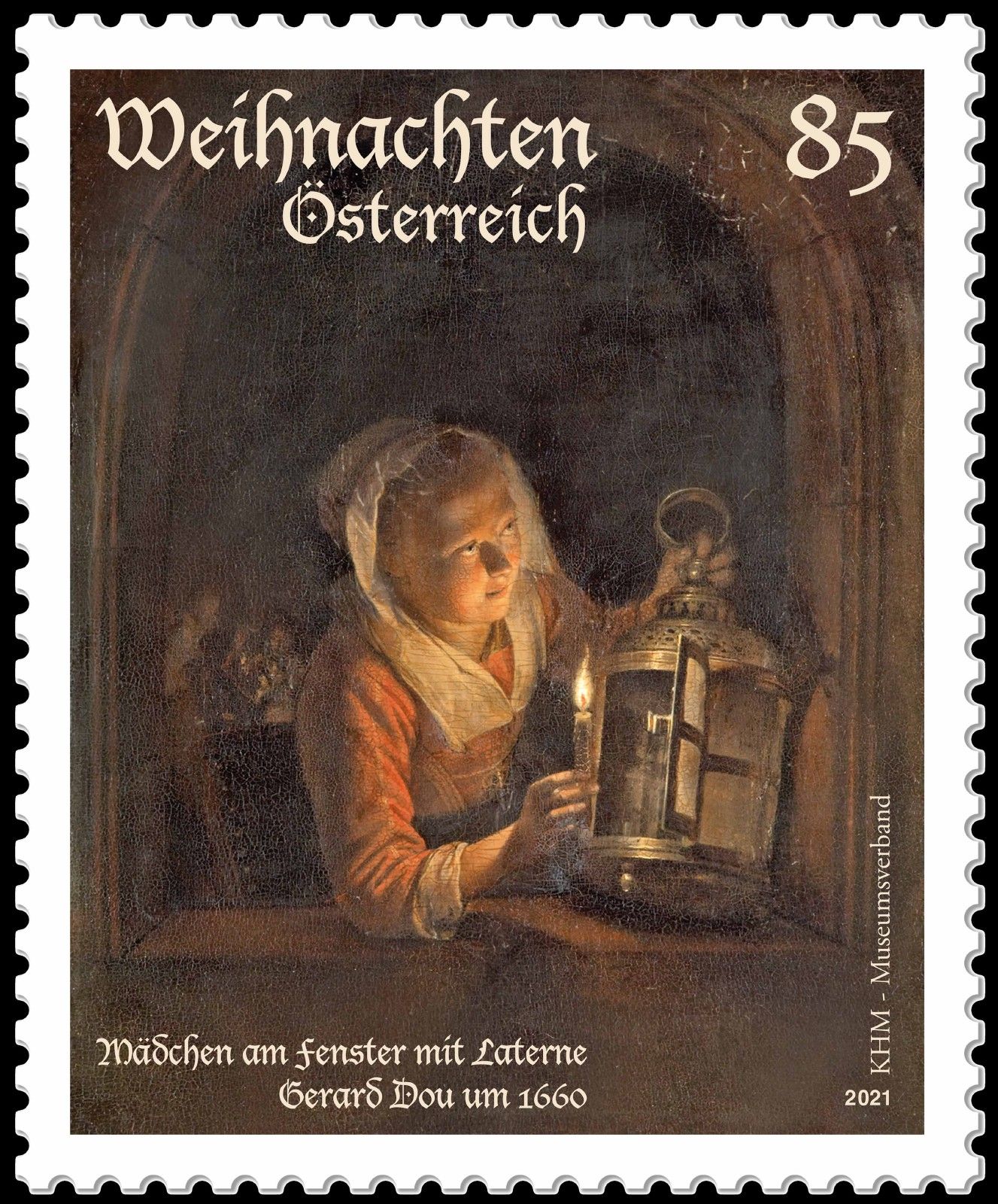 Die zweite Weihnachtsmarke zeigt das Mädchen mit Laterne v. Gerard Dou (1660), aus dem Kunsthistorischen Museum Wien.