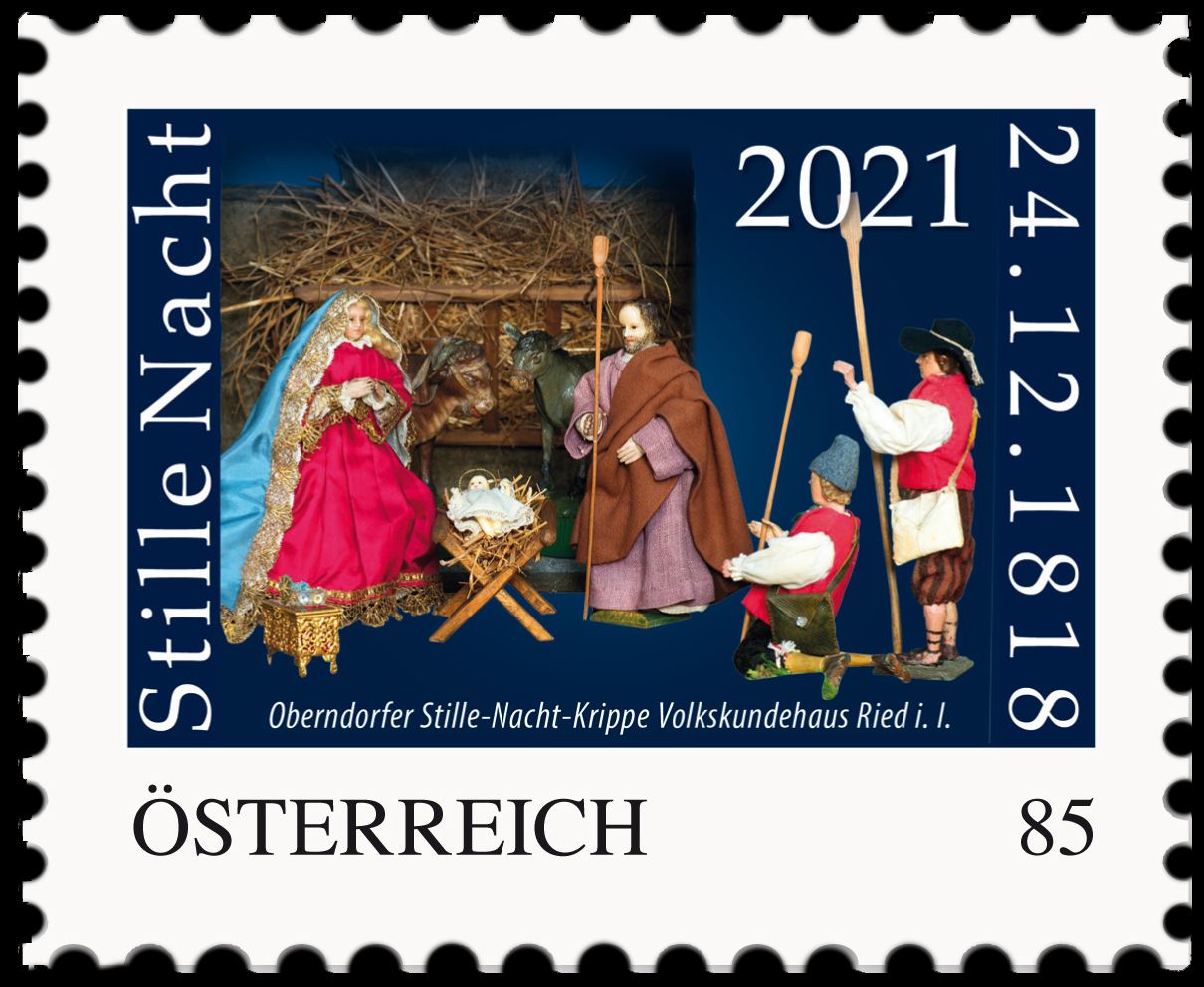 Die alljährliche personalisierte Briefmarke der Stille-Nacht-Gesellschaft aus Oberndorf zeigt jene Krippe, die am Weihnachtsabend 1818, als „Stille Nacht!" erstmals erklang, in der Kirche St. Nikolaus in Oberndorf stand.