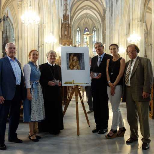 [Bild links oben] Präsentation der Sondermarke: Dr. Armin Lind (VÖPh-Vizepräsident/Region Süd), Kirsten Lubach (Graphikerin/Briefmarke), Abt Mag. Gerhard Hafner OSB, DI Kuno Mayer (Stifter der Gotik-Sammlung), Mag. Gerlinde Scholler (Österr. Post AG/Philatelie), Mag. Wilhelm Remes (Österr. Philatelistenverein St. Gabriel).