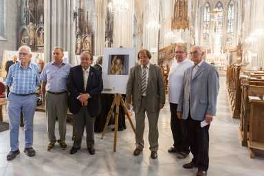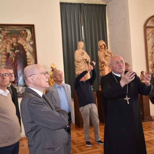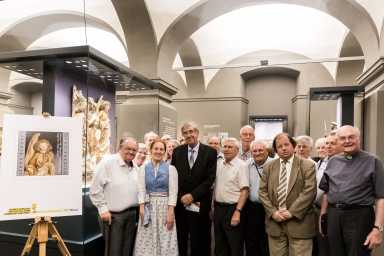 [Bild links unten] DI Kuno Mayer mit den „Gabis“ vor dem Objekt der Briefmarke in „seiner“ Gotik-Sammlung, Stiftsmuseum Admont.