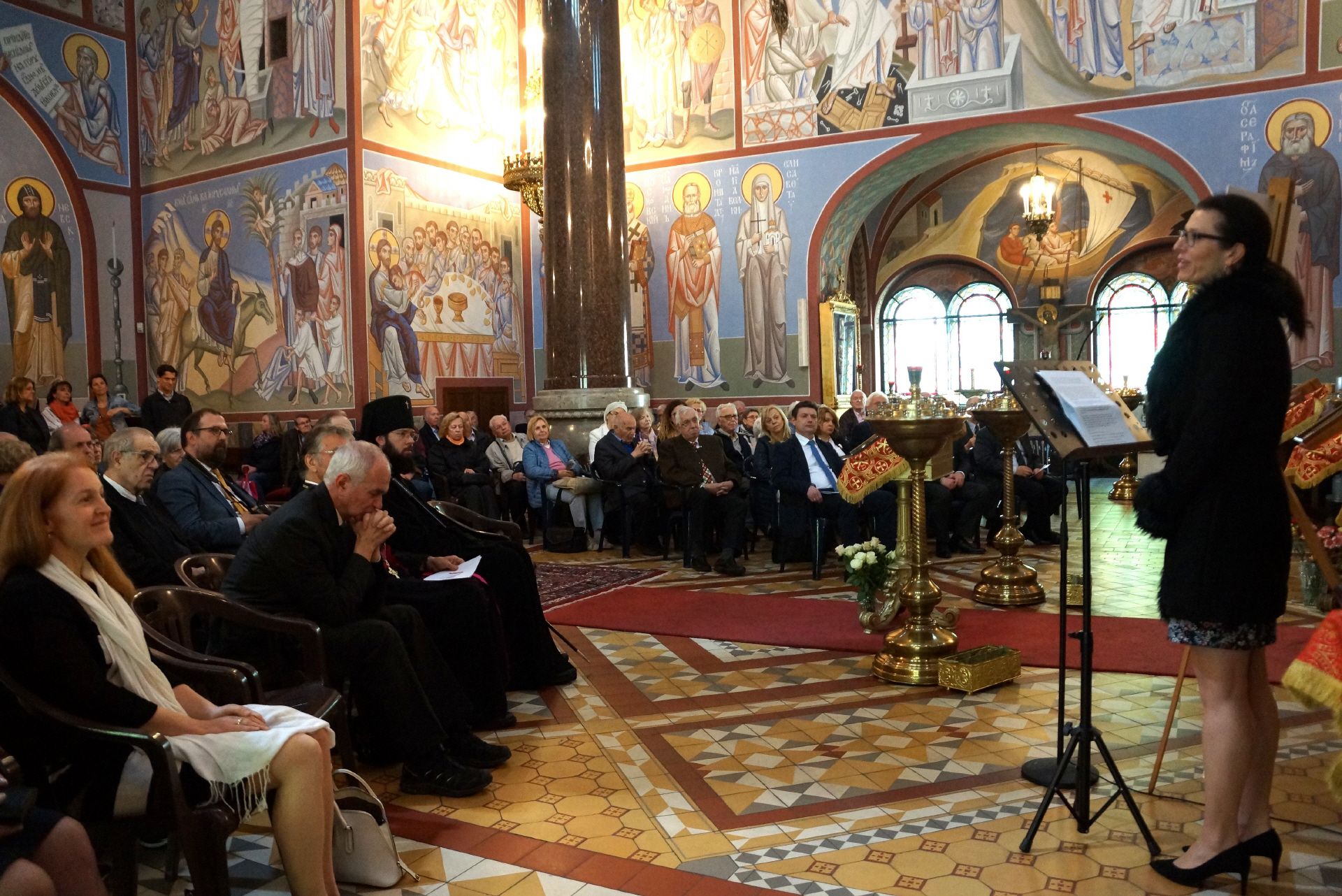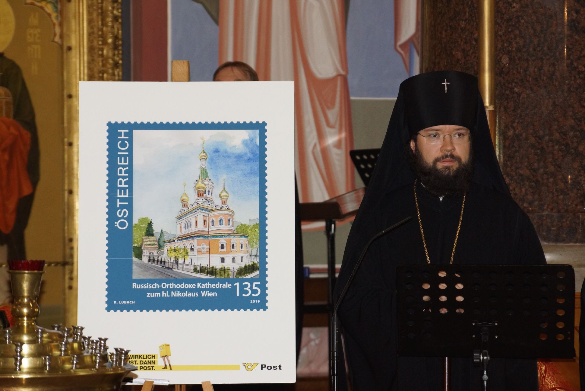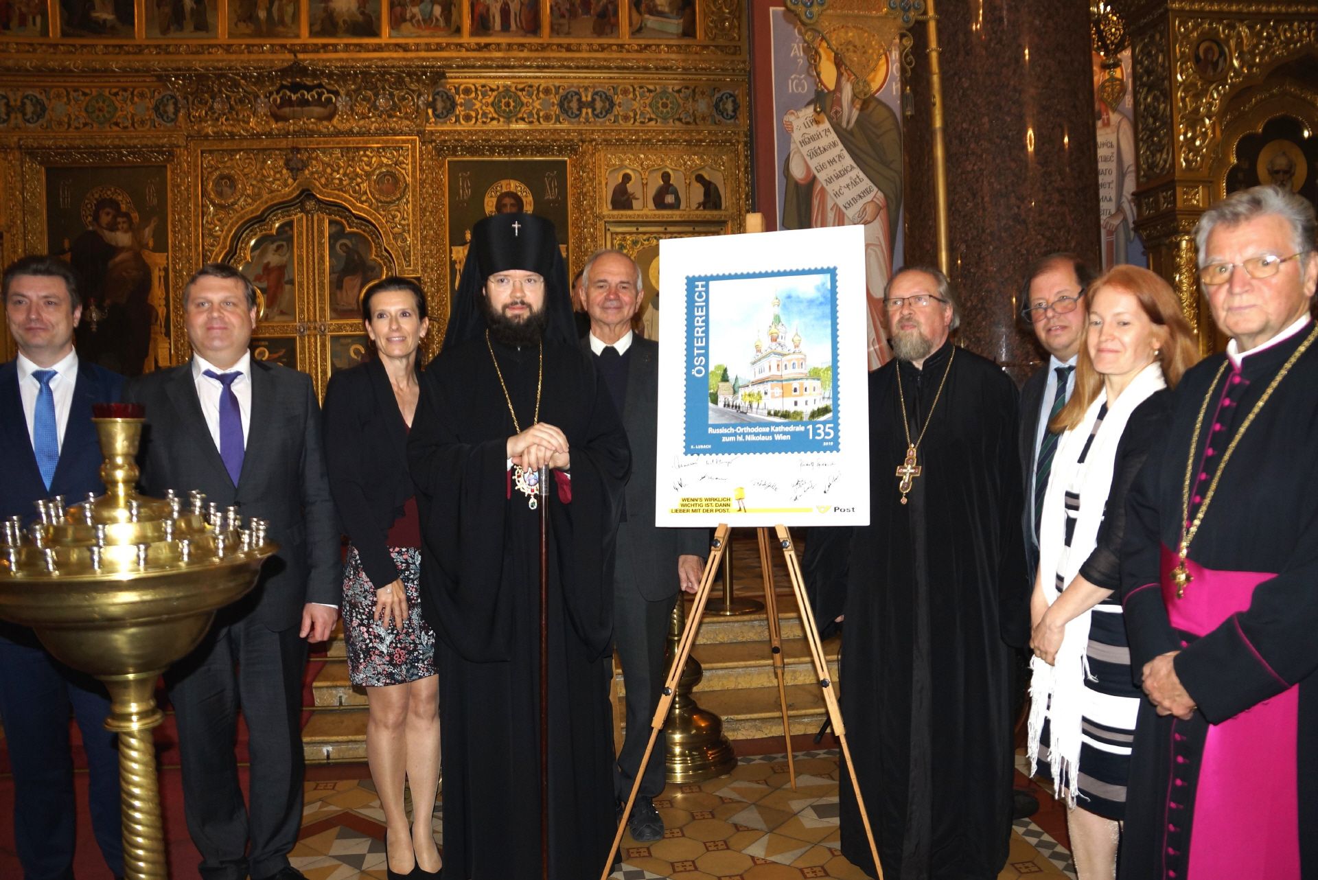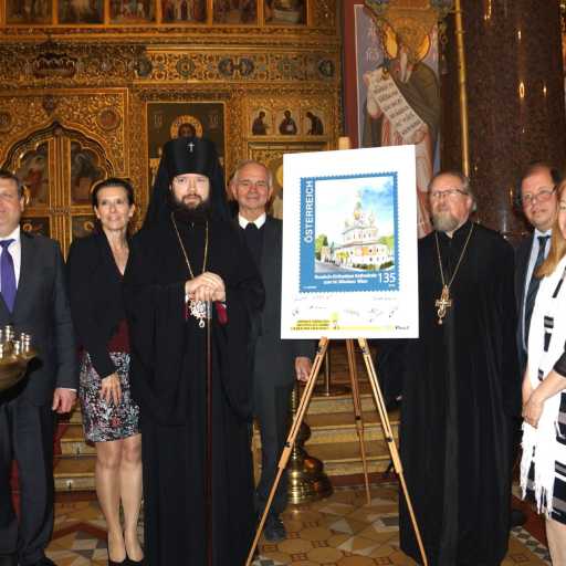 Trotz der zeitgleichen philatelistischen Großveranstaltung in Graz waren das Sonderpostamt und die Briefmarkenschau, die neben dem Objekt über Ikonen (Mag. Fritz Windbichler) auch Belege aus der Korrespondenzmappe von Kardinal König zeigte, sehr gut besucht. Bei der feierlichen Präsentation um 15 Uhr in der Kirche reichten die gebotenen Plätze bei weitem nicht aus, manche mussten mit einem Stehplatz Vorlieb nehmen. Es hatte sich überraschend hoher Besuch aus Moskau angesagt. Erzbischof Antonij, der sich selbst als Briefmarkensammler deklarierte, wurde aus Moskau extra für diese Veranstaltung eingeflogen. Seine Präsenz sowie der stimmgewaltige Russische Chor verliehen der Präsentation außerordentliche Würde und Ehrfurcht. Hernach gab es Russischen Tee und ebensolche Köstlichkeiten zu verkosten. Ein besonderer Dank ergeht an die Russisch-Orthodoxe Pfarrgemeinde in Wien sowie im Besonderen an Fr. Tatjana Lehninger – dank Ihrer Vermittlung und Organisation vor Ort wurde diese denkwürdige Feierstunde der Philatelie überhaupt möglich.