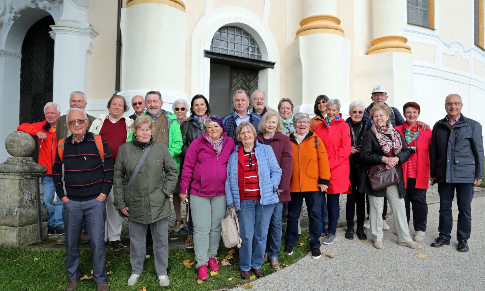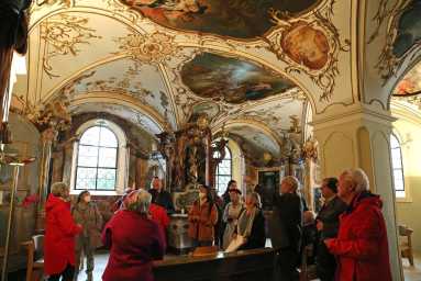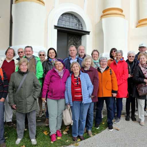 Die Anreise mit dem Bus der Firma Neubauer – es chauffierte uns der Senior-Chef Erich Neubauer – klappte bestens; mit dem Zustieg unserer beiden Willis, eines Reisegastes aus Kärnten und der Salzburger Reiseteilnehmer in Salzburg-Taxham waren wir komplett (25 Reisende). Mit dem ersten Aufenthalt in Bayern am Tegernsee im gleichnamigen Ort, wo wir die ehem. benediktinische Stiftskirche St. Quirin besichtigten und sogleich die urbayerische Gastlichkeit im nebenanliegenden Bräustüberl genießen konnten, besserte sich das Wetter zusehends, es waren uns gar Sonnenstrahlen gegönnt. Durch die langjährige Serie „Der Bulle von Tölz“ war uns das nächste Reiseziel Bad Tölz vom Namen her wohl vertraut; der Eindruck der zahlreich freskierten Häuserfassaden der Marktstraße überraschte dennoch, insbesondere jene Fresken der Rädelsführer des Bauernaufstandes im Jahr 1705 gegen die österreichische Besatzungsmacht, der allerdings eine Woche später durch die „Sendlinger Mordweihnacht“ sein blutiges und brutales Ende fand. Es ging auch bergauf zum Kalvarienberg, dessen Ensemble durch eine heilige Stiege – gestaltet nach ihrem römischen Vorbild im Lateran – bekrönt wird. Gerade noch im letzten Schimmer der abendlichen Dämmerung erreichten wir unser Hotel „Alte Post“ am Hauptplatz im beschaulichen Städtchen Schongau, das uns bis Sonntag sehr gutes Quartier und gemütliche Abende mit preisgünstigen Getränken bot. Die Besichtigungen unseres zweiten Reisetages begannen vor bzw. auf dem Gelände des von Herzog Tassilos begründeten Wessobrunner Klosters, das zahlreiche Stuckateure des Barocks und des Rokokos der gleichnamigen Wessobrunner Schule hervorbrachte. Wir begannen bei der stimmigen Dorflinde – auch Tassilo-Linde genannt –, wo das Wessobrunner Gebet auf einem Felsen wiedergegeben ist. Trotzdem ein Großteil des Klosters abgebrochen wurde, ließen die Reste wie der Südflügel die Mächtigkeit der einstigen Anlage erahnen. Erhalten hat sich das die pittoreske Anlage mit dem Brunnenhaus und der drei Quellen – Teil der Gründungssage Wessobrunns. Nach einer Umleitung über eine steinige Forststraße erreichten wir den Marienmünster von Dießen, eine ehemalige Augustiner-Chorherren-Kirche, wo neben einem ersten gewaltigen spätbarocken Raumeindruck der Dießener Himmel – ein Kuppelfresko mit 28 Heiligen und Seligen aus dem Grafengeschlecht des Andechser Grafengeschlechtes - die Blicke auf sich zog. Das Stichwort war nun gefallen – zur Mittagspause steuerten wir den Bayerischen Bierhimmel – den Klosterberg Andechs an. Hier waren im Gegensatz zu den anderen Zielen unserer Gildereise die Corona-Bestimmungen sehr rigid: Die Stiftskirche konnte man nur durch einen abgesteckten Bereich im hinteren Bereich durchqueren, die sehnsüchtig erwartete Einkehr im Andechser Bräu konnten selbst die peniblen Eingangskontrollen und die nur durch Umwege erreichbaren Speise- und Getränkeausgaben nicht verhindern. Glücklich und gelöst war der, der mit deftiger Speise und Trank die vorreservierten Plätze erreichte. Am Nachmittag widmeten wir uns zur Gänze der Klosteranlage Polling, einem weiteren säkularisierten Stift der Augustiner-Chorherren, deren heutige Pfarrkirche dem hl. Kreuz geweiht ist – ein um 1180 auf Pergament gemalter Gekreuzigter, der ein älteres Fichtenkreuz ummantelt. Die ganz im Rokoko gehaltene Reliquienkapelle verzückte vollends; der schon dem Klassizismus verhaftete Bibliothekssaal mit einem ausgeklügelten Freskenprogramm übertraf unsere Erwartungen, ergänzt um den schwer fassbaren Umstand, dass dieser, im völlig desolaten Zustand befindlich, erst vor rund 35 Jahren wieder saniert werden konnte.
