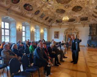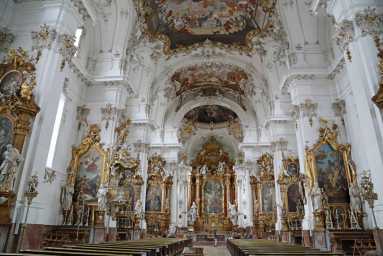 Der dritte Reisetag führte uns zum ehemaligen Benediktinerkloster Benediktbeuern, das heute von den Salesianern Don Boscos besiedelt ist. Ein Mitbruder P. Salesnys – P. Johannes Neuner – führte unsere Gruppe durch den Kreuzgang, in den frühbarocken Festsaal mit üppiger Stuckatur und 29 Öl-Deckengemälden mit außergewöhnlichen Motiven (Blutbrunnen) sowie in die Stiftskirche, in der sich mit den Deckenfresken ein Frühwerk von Georg Asam befindet. Die hinter dem Chor befindliche ovale Anastasia-Kapelle ist ein Rokokojuwel ersten Ranges, die Besichtigung war nur durch das Gitter möglich. Bevor es in die Mittagrast in Murnau am Staffelsee ging – ein Teil suchte das traditionsreiche Griesbräu auf –, galt es noch einen Blick in die Pfarrkirche St. Nikolaus zu werfen ob ihres achteckigen Zentralraumes. Da es sich witterungsbedingt nicht empfahl, den 1700 Meter hohen Herzogstand aufzusuchen, blieben wir im beschaulichen Murnau, um das Gabriel-Münter-Haus zu besichtigen, in dem auch die Künstlerkolonie des Blauen Reiters verkehrte; Wassily Kandinsky wohnte dort fünf Jahre und verewigte sich dort mit seinen künstlerischen Leistungen im Stiegenhaus bzw. auf diversen Einrichtungsgegenständen. Es ging nun zurück in die alte Ansiedlung Schongaus – nach Altenstadt. Dort überraschte uns mit der St. Michaelskirche die einzige romanische Kirche Oberbayerns - ein Beispiel romanischer Baukunst par excellence und zugleich eine willkommene Abwechslung zum bisher gebotenen Barock und Rokoko. Für die Nimmermüden gab es als Abschluss des Tages noch eine Besichtigung der Schongauer Altstadt mit der Pfarrkirche Mariä Himmelfahrt, die neben der schon gewohnt üppigen Rokoko-Ausstattung mit einer personifizierten Darstellung des hl. Geistes aufwartete.