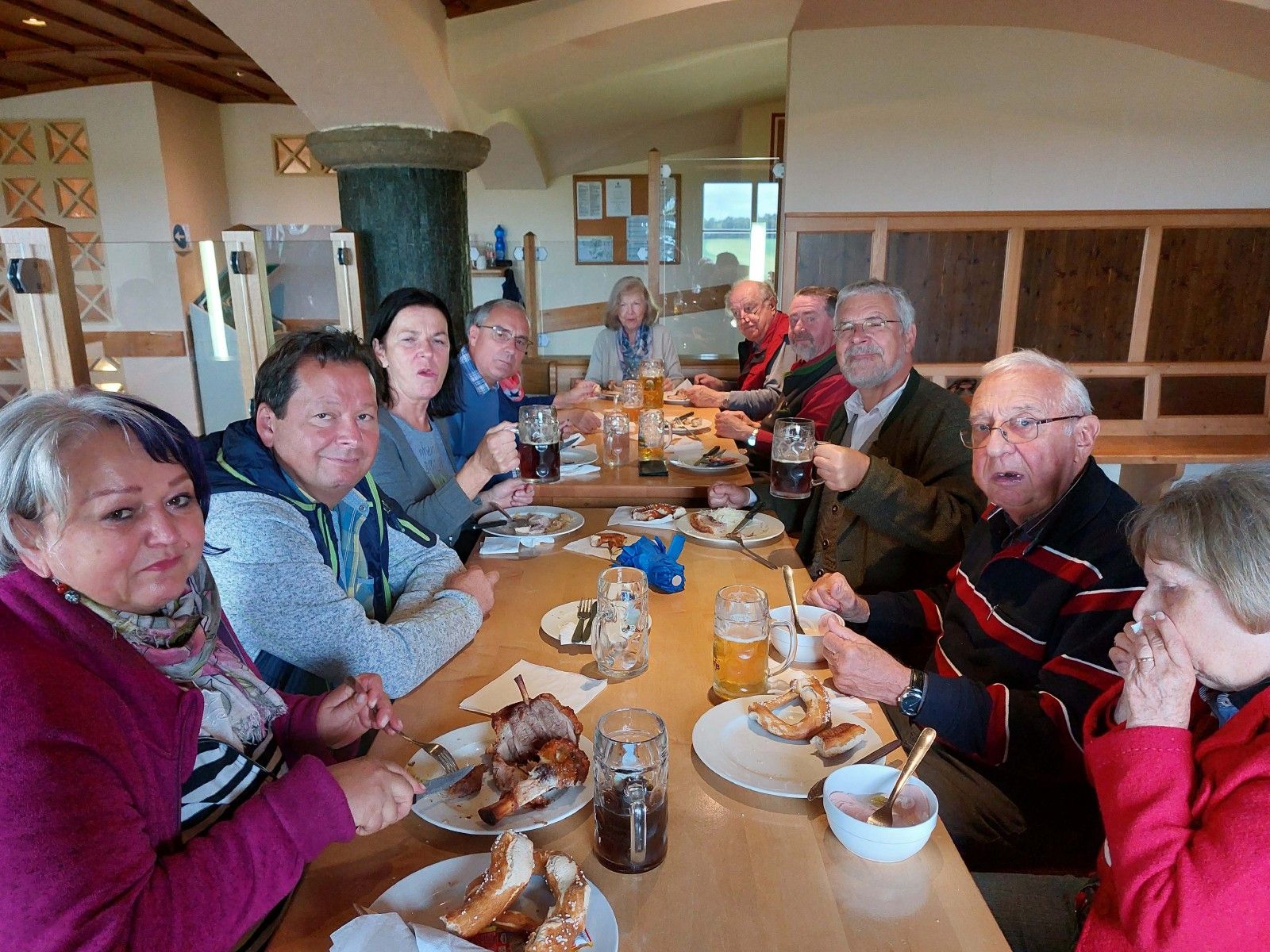 Am Rückreisetag erwartete uns mit der Metropole am Eingang des Pfaffenwinkels - Landsberg am Lech – eine ehemalige Grenzstadt zu Bayern mit pittoreskem Stadtbild, Stadtmauer und zahlreich erhaltenen Stadttoren. Nachdem in der Stadtpfarrkirche infolge eines bevorstehenden Gottesdienstes kein Besuch möglich war, begab sich der fußläufige Teil der Gruppe steil bergauf zur ehem. Jesuitenkirche und zum erst kürzlich renovierten Bayertor. Nach zähflüssigem Verkehr rund um München erreichten wir mit Traunstein den letzten Ort unserer Reise durch Bayern; auch da steuerten wir erfolgreich ein uriges Brauhaus an, das uns in Rekordzeit gut verköstigte, sodass die in Salzburg Aussteigenden mitunter ihre Anschlusszüge rechtzeitig erreichten und auch der ostösterreichische Gruppenteil seine Ziele zu rechtschaffener Zeit erreichte.
