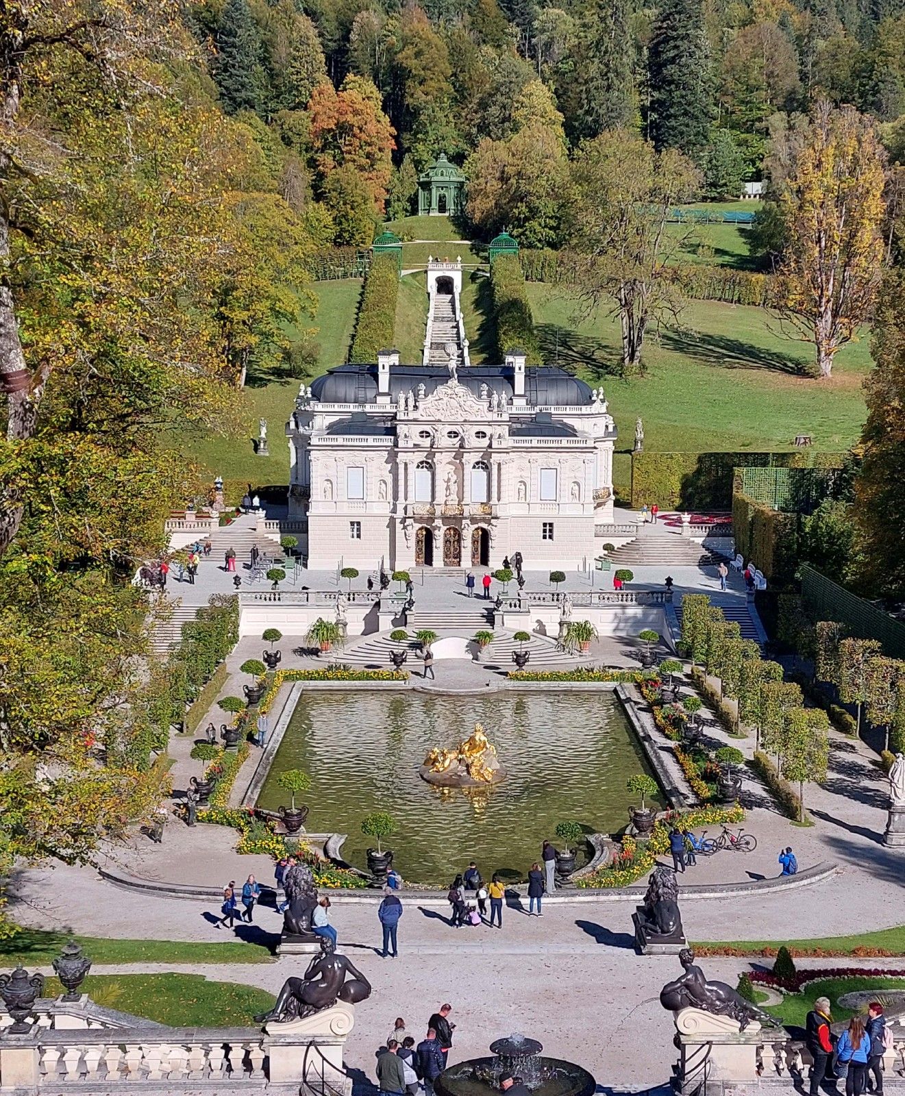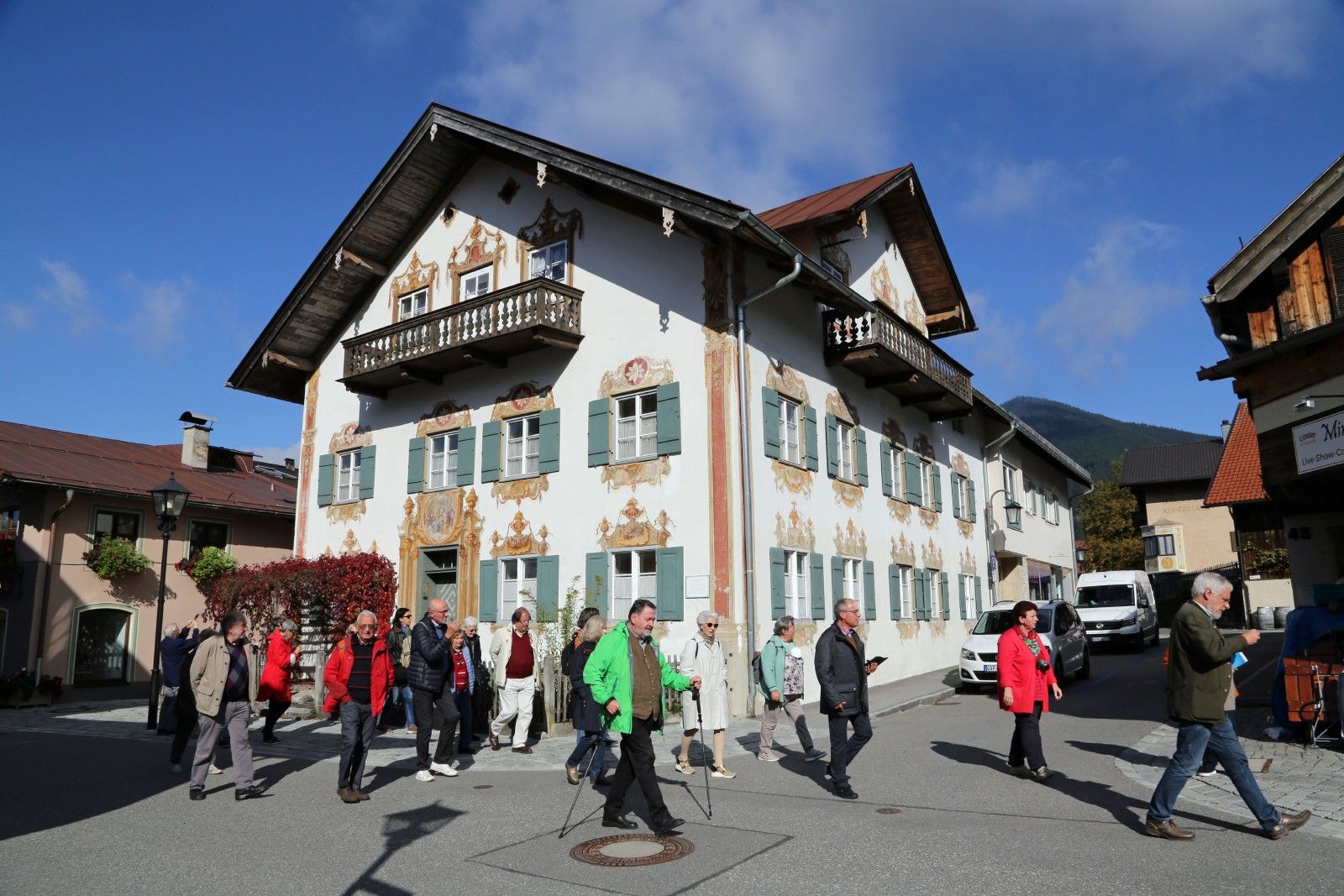 Das schönste Wetter der Reise stellte sich am vierten Tag ein mit der Fahrt in den Oberammergau. Allerdings umhüllte vorerst hartnäckiger und dichter Nebel die ehem. Augustiner Stiftskirche in Rottenbuch und anschließend die Benediktinerabtei Ettal. Rottenbuch erwartete uns mit Rokoko-Zauber in gotischem Gehäuse, wie ein roter Faden zog sich die Lebensgeschichte des hl. Augustinus durch das von Matthäus Günther geschaffene Freskenprogramm. Den landschaftlichen Höhepunkt des Besichtigungstages bildete freilich Schloss Linderhof im Grasswangtal – ganze zwei Autobusse steuerten das ansonsten touristenüberlaufene Schloss des exzentrischen bayerischen König Ludwigs II. an, das einzige Schloss, das er vollenden und auch länger bewohnen konnte. Die churrigueresk-üppige Innenausstattung des Schlosses musste man erst verkraften – der romantische Schlosspark mit seinen Götterwesen und Wasserkaskaden und exotischen Häusern beeindruckte aber jedermann! Den Mittagsaufenthalt legten wir in Oberammergau – dem Zentrum der Lüftlmalerei – ein. Unser Reiseleiter Willi Deuer verstand es uns in einem Minimum an Zeit vorbei an einem Maximum von opulent freskierten Häusern zu führen! Die Superlative des bayerischen Kirchenrokokos stand uns noch bevor – die Wallfahrtskirche zum gegeißelten Heiland – kurz Wieskirche genannt: Die Gebrüder Zimmermann schufen hier einen „Tanzsaal Gottes“, der aus einem ovalen Rundbau und einem Quer-Rechteckraum gebildet wird, durchströmt von züngelnder und flirrender Raumbewegung. Beschaulich hingegen war wiederum unsere letzte Besichtigung des Tages – das ehem. Prämostratenserkloster Steingaden – eine Welfengründung, dessen Basilika uns mit einer romanischen Zweiturmfassade empfing, im Inneren jedoch erneut eine barocke bzw. Rokoko-Ausstattung aufwies; dieses Mal stand die Biographie des Ordensgründers Norbert von Xanten im Mittelpunkt. Für einen Teil der Gruppe beschloss sich der programmreiche Tag mit einer hl. Messe in Schongau, bei dem wir ein ungemein strenges Corona-Regime zu spüren bekamen – selbst Eheleute durften nicht beisammensitzen und der kommunionspendende Pfarrer wurde durch mobile Glasparavents abgeschirmt.