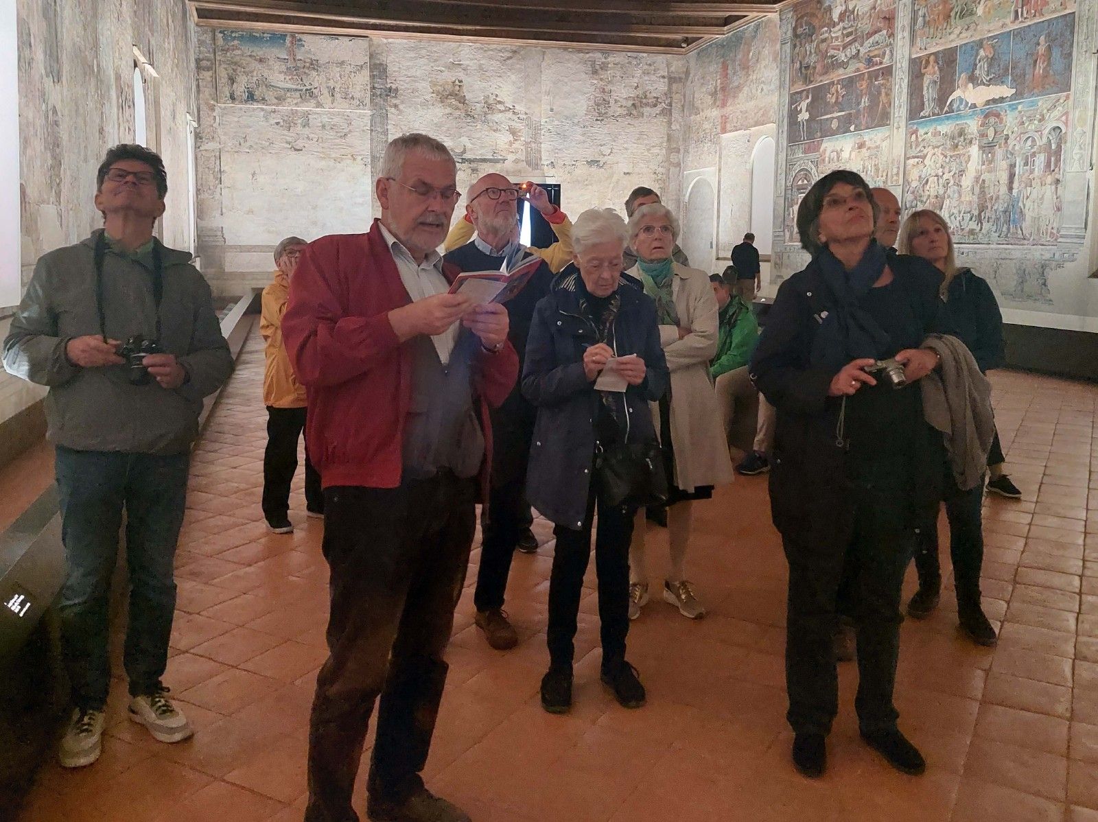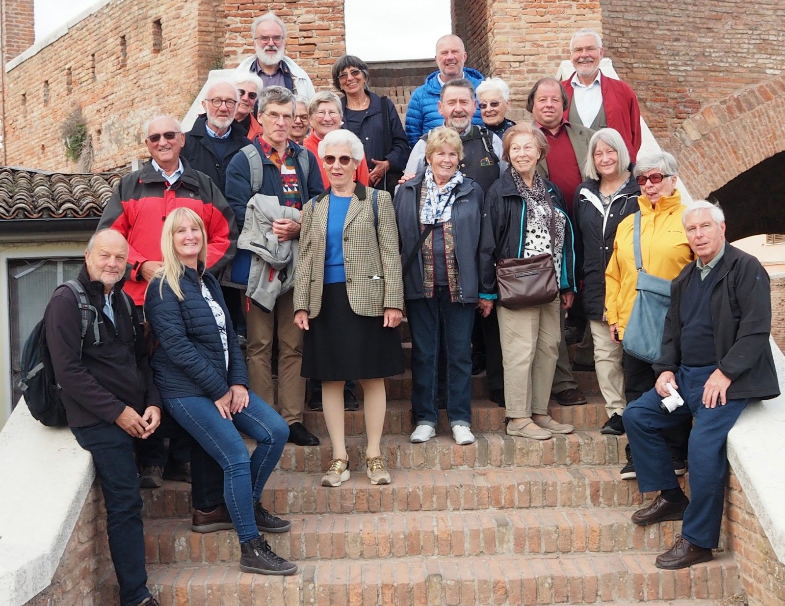 Von 15. – 21. Oktober führte die gelungene Gildereise 2023 nach Montegrotto in Venetien am Fuße der Euganeischen Hügel, um unter der meisterhaften und erfahrenen Führung unseres GB Dr. Wilhelm Deuer Kulturausflüge in die nähere Umgebung zu unternehmen als auch der körperlichen Wellness in den reichlichen Badeanlagen in unserem Hotel Bellavista Zeit und Raum zu geben, was von den 23 Teilnehmern sehr genossen wurde. Heuer durften wir auch wieder einige Gäste begrüßen, die sich auf die Gildereise mit uns begaben. Bereits am Anreisetag – der sowohl von Wien mit der Bahn als auch von Salzburg mit dem Bus der Fa. Neubauer via Villach problemlos verlief – tauchten wir mit dem Besuch von Padova (Santo, Palazzo della Ragione) in das italienische Leben und Flair ein. Das Programm führte in pittoreske Orte der Umgebung (Este, Monselice, Montagnana mit seinen Stadtmauern, Arqua Petrarca), als auch mit dem Besuch von Ferrara und der von Kanälen durchsäumten Fischer-Stadt Comacchio in die benachbarte Emilia Romagna. Besonders hervorzuheben ist der Besuch des Parco Valsanzibio, ein Meisterwerk barocker Gartenbaukunst Venetiens und von Vicenza mit den zahlreichen Bauten Palladios und dem vielgerühmten Teatro Olimpico, gefolgt von den Palladio Villen am Monte Berico (Villa Valmarana u. Rotonda) und in Fanzolo bei Treviso (Villa Emo), jeweils mit prachtvollen Fresken mit Genreszenen bzw. Motiven der antiken Götterwelt. Letztgenannter Stadt widmeten wir eine ausführliche Besichtigung, die mit ihren zahlreichen Kanälen und einer quirligen Innenstadt und bemerkenswerten Kirchenausstattungen beeindruckte. Nicht unerwähnt dürfen die beiden verträumten Abteien Santa Maria delle Carceri bei Este und Sesto al Rhegeno (bereits knapp in Friaul) bleiben, die jede auf ihre Weise unerwartete Kunst- und Raumeindrücke preisgaben.