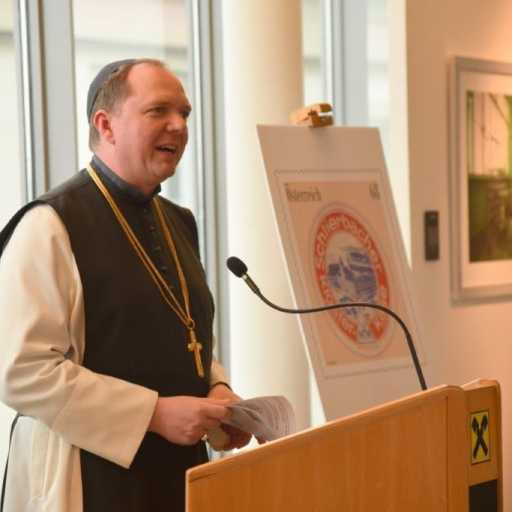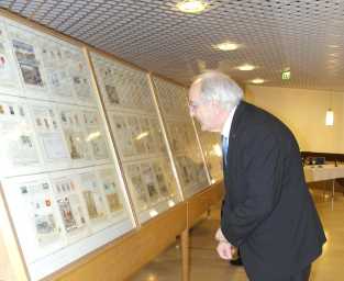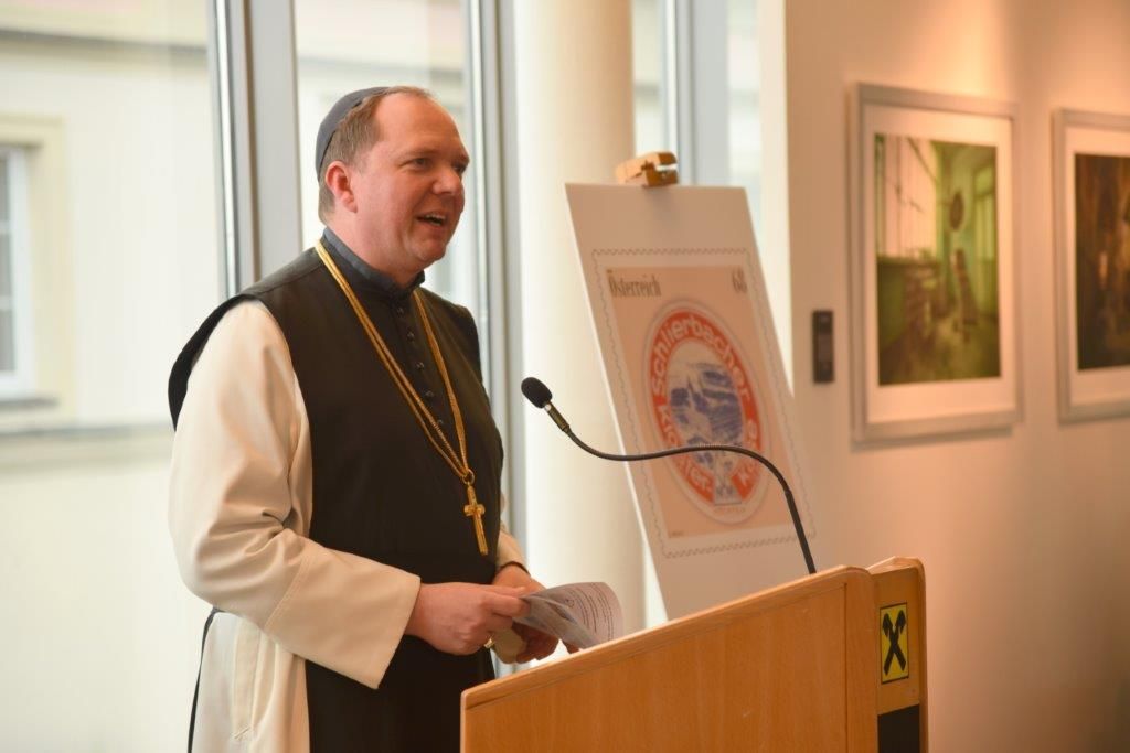Bild 3: Auch der Bischof der evangelischen Kirche Österreichs Prof. Dr. Michael Bünker findet Interesse an der Briefmarkenschau.