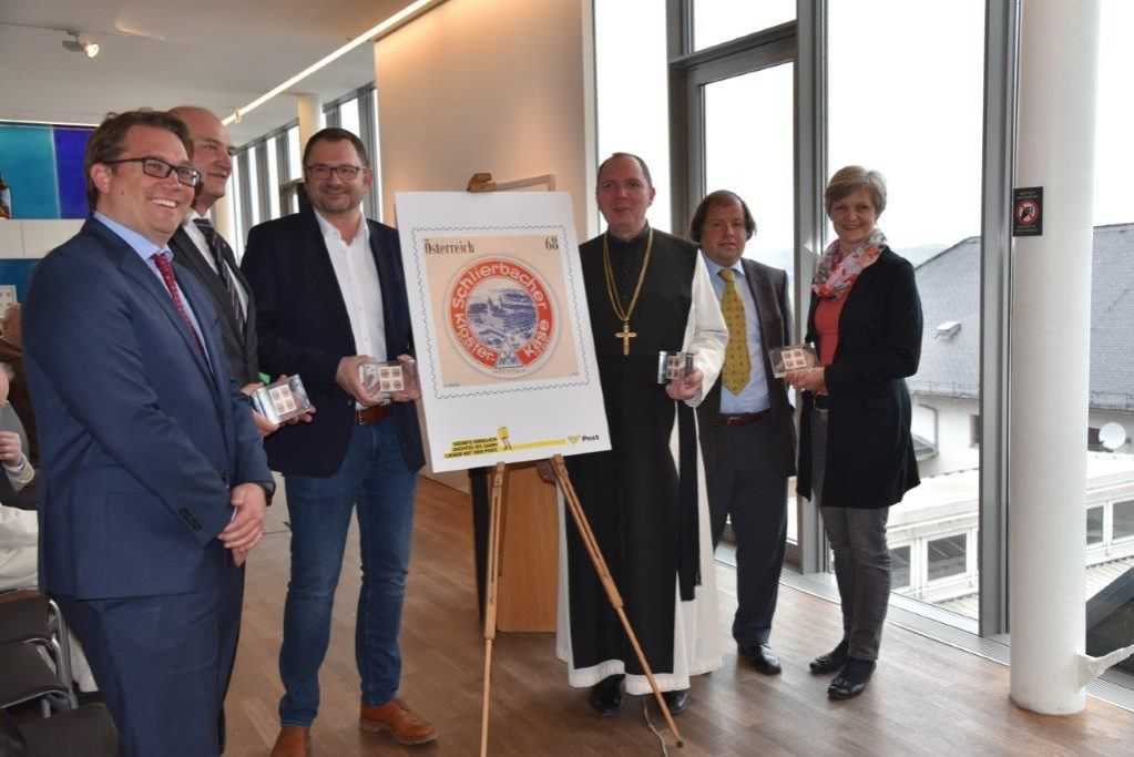 Photo (© Karl Hrncir): Stefan Nemeth (Leitung Philatelie, Österreichische Post AG, LAbg. Bgm. Dr. Christian Dörfel, Friedrich Mitterhumer (Geschäftsführer Klosterkäserei Schlierbach), Abt Mag. Nikolaus Thiel (Stift Schlierbach), Mag. Wilhelm Remes (Obmann St. Gabriel) und Katharina Seebacher (Bürgermeisterin-Gemeinde Schlierbach).