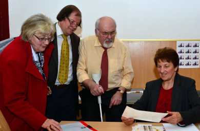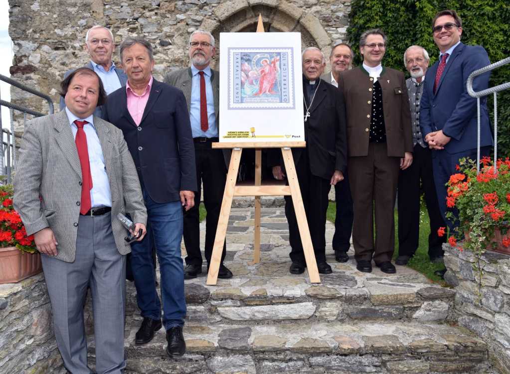 Mag. Wilhelm Remes (Österr. Philatelistenverein St. Gabriel, Dr. Armin Lind (VÖPh-Region Süd), Bgm. Erich Kessler, Dr. Wilhelm Deuer (stv. Leiter Landesarchiv Kärnten), Altbischof Dr. Maximilian Aichern, Markenkünstler Peter Sinawehl, Pfarrprovisor MMag. Dr. Johann Sedlmaier, Prof. Bernhard Wolfsgruber („Burgherr“), Stefan Nemeth (Leitung Philatelie, Österreichische Post AG)