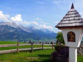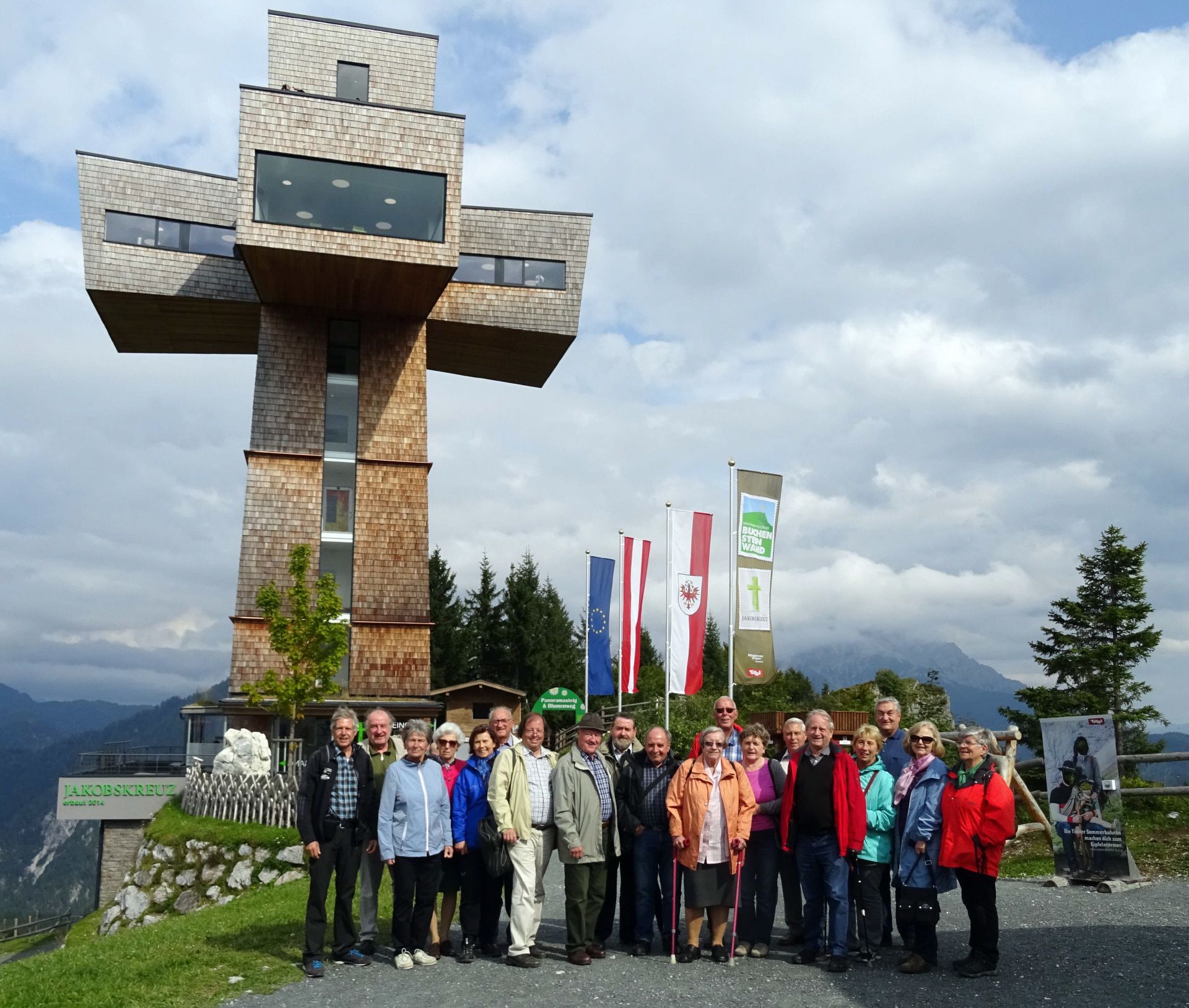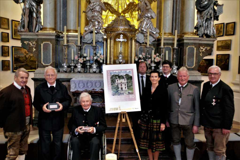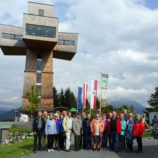 Aus diesem Anlass durften jene Mitglieder des österreichischen Philatelistenvereins St. Gabriel, die ins Salzburger Saalachtal angereist waren, das noch bäuerlich geprägte St. Martin b. Lofer und seinen pittoresken Wallfahrtsort Maria Kirchental – in einem Hochtal der Loferer Steinberge erleben. Im Zuge des samstägigen Ausfluges wurde das Bergbaumuseum in Leogang mit seinem Gotikschätzen von internationalem Rang besichtigt, danach ging es zur Mittagspause auf die Huggenberger Alm oberhalb Saalfeldens, die einen wunderbaren Blick auf die Leoganger Steinberge bis hinüber zum Hochkönig bot. Das Ziel des Nachmittags war das 2014 errichtete 30 m hohe Jakobskreuz auf dem Großen Buchstein, das mit dem Aufzug befahrbar ist und in den Kreuzarmen eine grandiose Aussicht bietet – es wird auch das größte begehbare Stahlkreuz der Welt genannt.