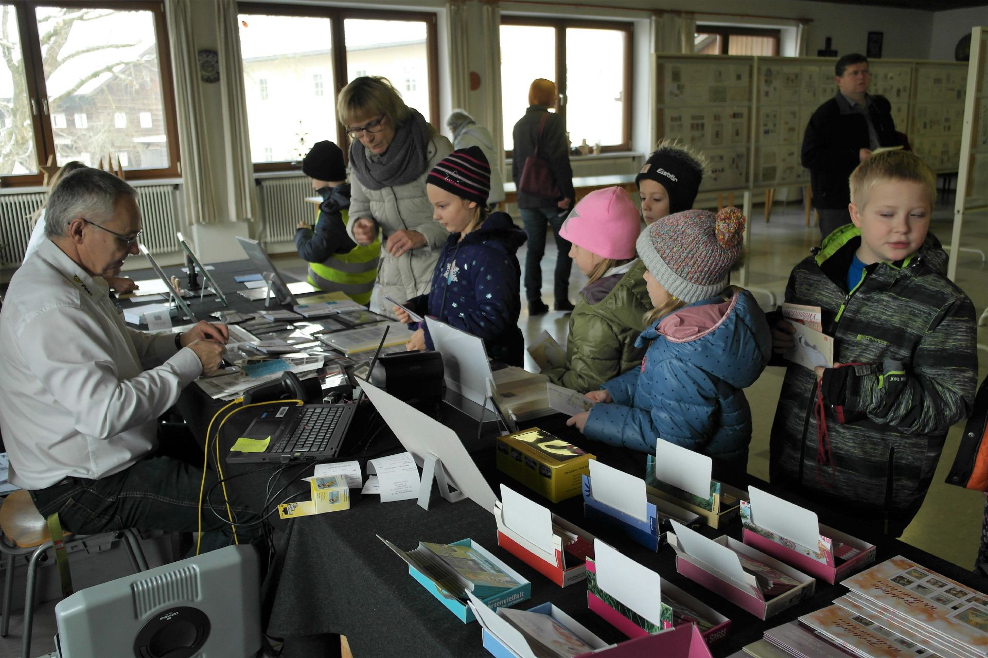 Für das der Philatelie-Ost (Hr. Bernhard Adlmann, Fr. Karin Pugl) machte sich die weite Anfahrt aus Wien mehr als bezahlt. Von Öffnung bis Schließung (10-17 Uhr) war das Sonderpostamt im Saal des GH Dobler stets sehr gut besucht. Die Gemeinde Altschwendt mobilisierte Groß und Klein für diesen besonderen Tag in der Ortsgeschichte. Beeindruckend war der bestens orchestrierte Besuch der Kindergarten bzw. Volksschulgruppen, die liebevoll vorbereitete Briefe mit den Weihnachtsmarken frankierten und zur Abstempelung mit dem Sonderstempel brachten. Für viele war dies eine völlig neue Erfahrung. Die Jugend lernte auf diese Weise das Wesen wie Funktionieren eines Postamtes kennen und die Österreichische Post AG gewinnt so die „Kunden von morgen“!