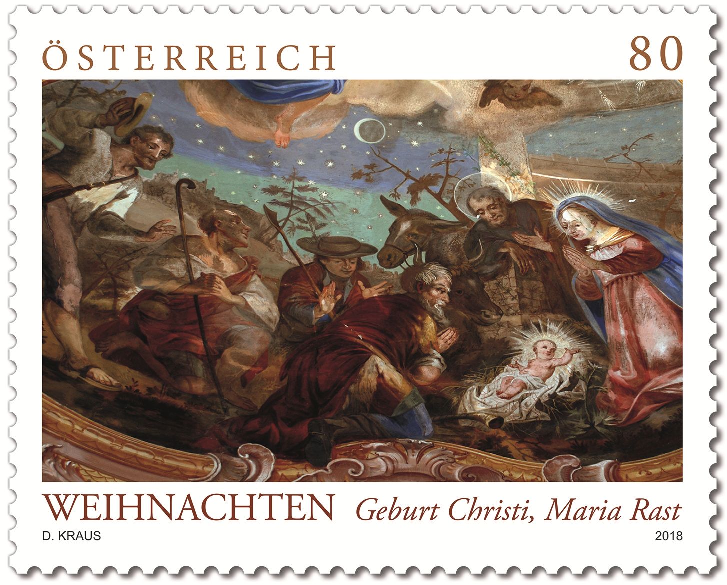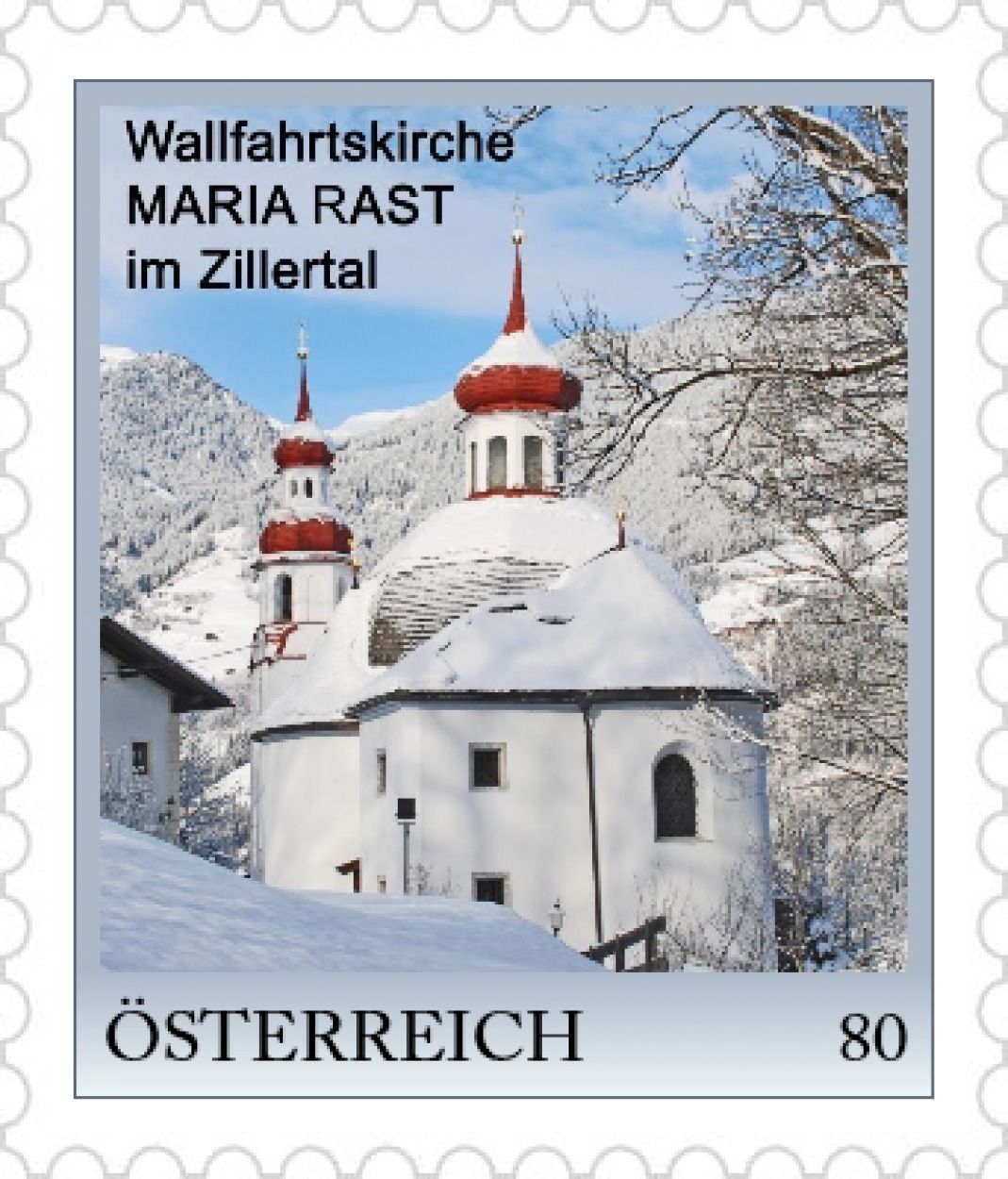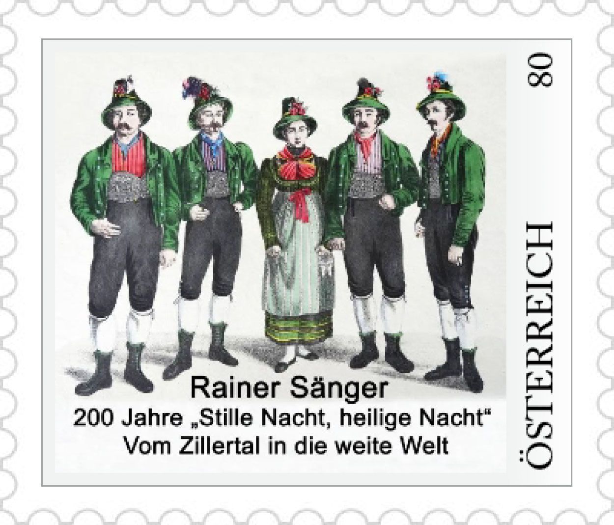 Die nassklebende Variante zeigt die Geburt Christi aus dem 1741 fertiggestellten Deckengemälde von Josef Michael Schmutzer in der nahen Wallfahrtskirche Maria Rast am Hainzenberg (siehe Sonderstempel sowie zwei pers. Marken) am Anstieg zum Gerlospass. Es kommt ein zweiter Sonderstempel des BSV Zillertal – geschaf-fen von Maria Schulz - zum Einsatz, der die Sängerfamilie Rainer aus Laimach im Zillertal zeigt (ebenso die entsprechende pers. Briefmarke). Mit diesem Sonderstem-pel soll auf die 200-jährige Tradition des Weihnachtsliedes „Stille Nacht – Heilige Nacht“ sowie auf den besonderen Umstand hingewiesen werden, dass das besagte Weihnachtslied gerade über die Sängerfamilien Strasser und Rainer im Zillertal weltweite Verbreitung gefunden hat (1832 Leipzig, 1839 New York). Eine nicht un-wesentliche Rolle kam dabei dem Orgelbauer Carl Mauracher zu, der das Stille Nacht-Lied von seinen Arbeitseinsätzen in Oberndorf bzw. Arnsdorf über das Ger-lostal ins Zillertal brachte.