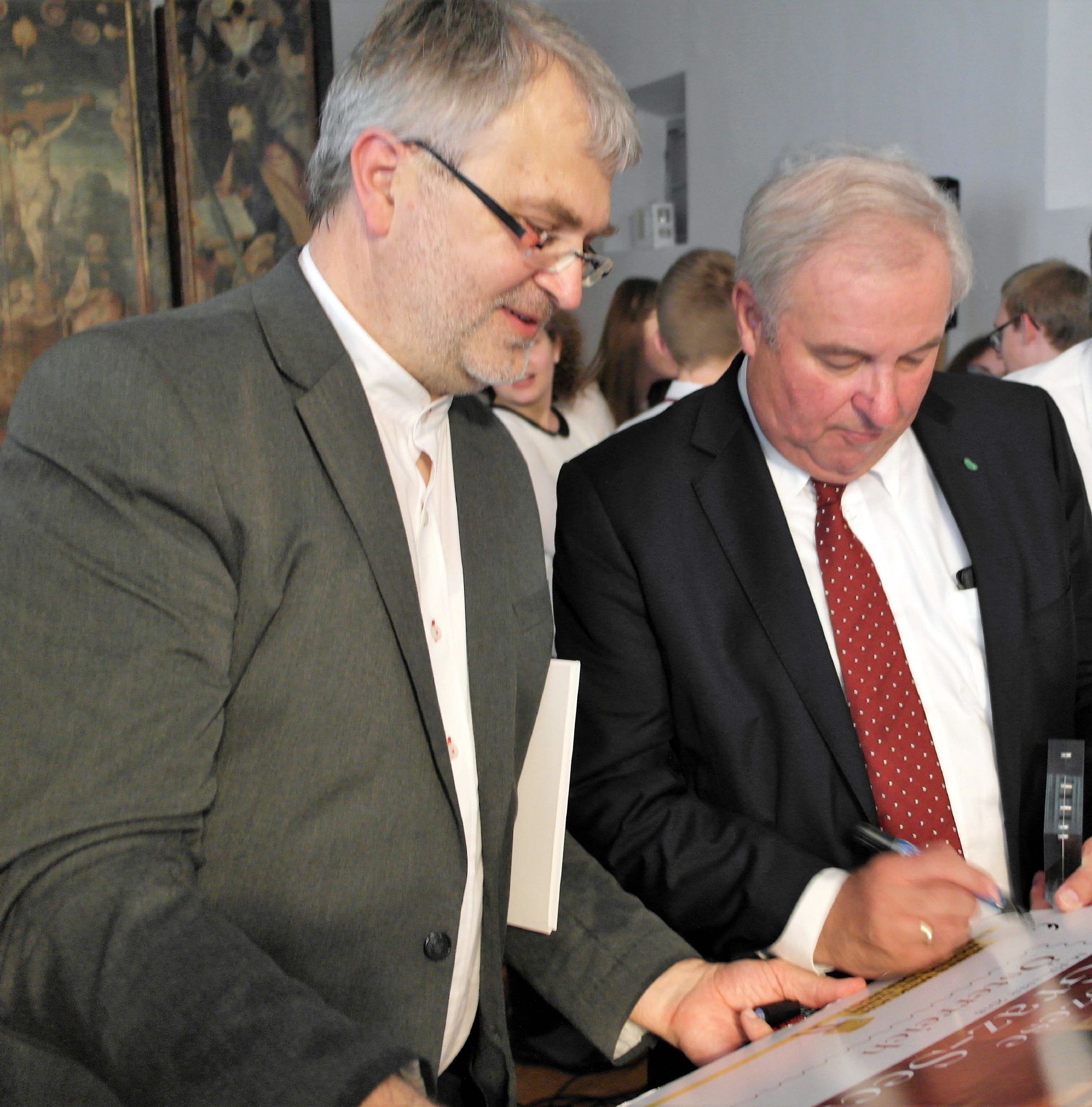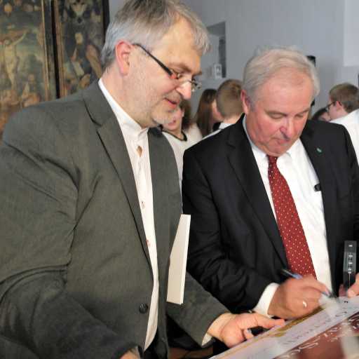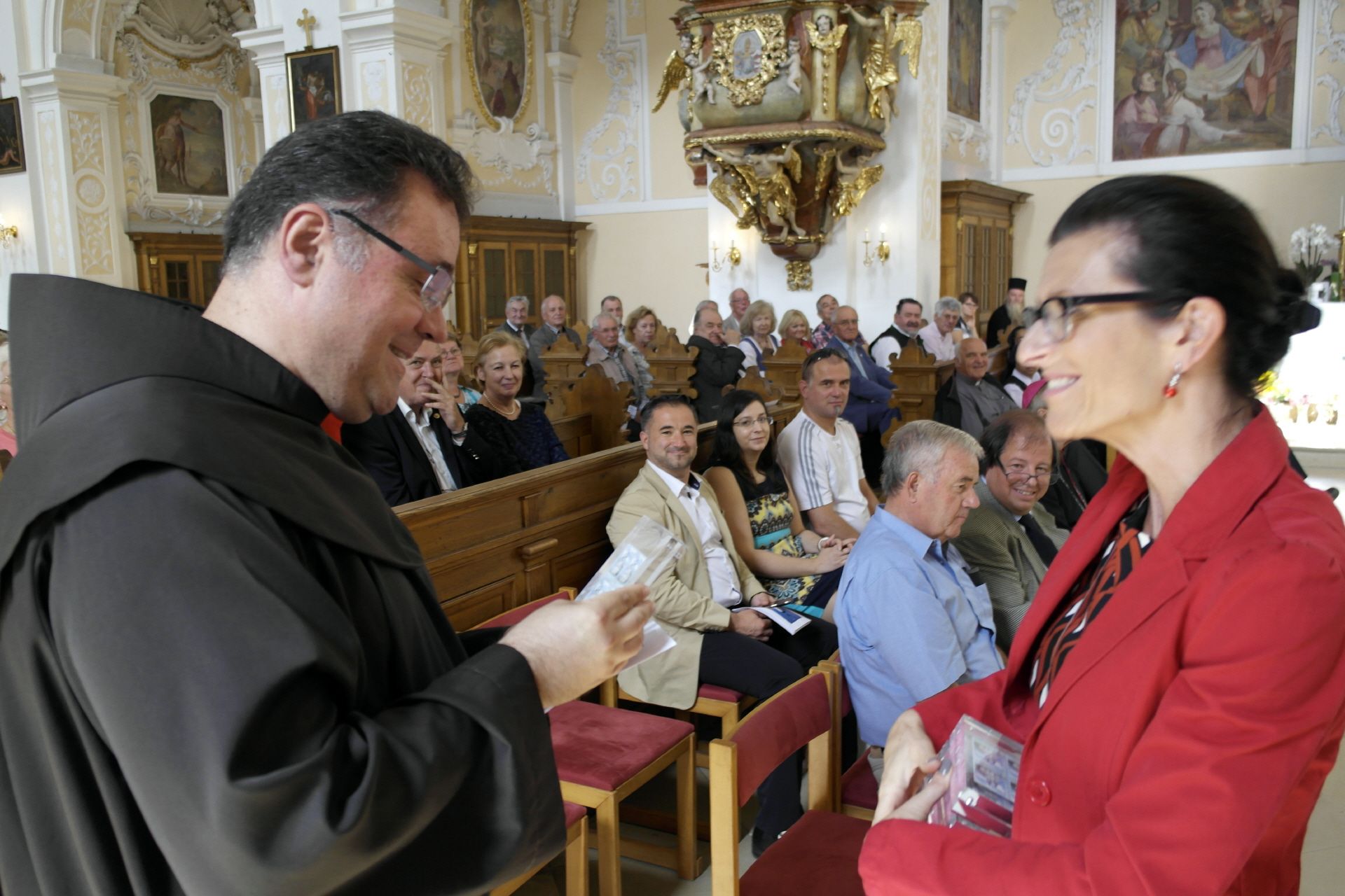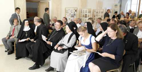 Legende Bild links: v.l.n.r.: HR Dr. Karl Ohnmacht (Ehrenobmann Gilde St. Gabriel), Abt Paisios Jung, Ing. Alfred Kunz (Präs. Stellvertr. VÖPh), Manfred Reithofer (Österr. Post AG), Mag. Wilhelm Remes (Obmann Gilde St. Gabriel), Bischof Franti ek Rabek (Slowakei), Pfr. Jan Vallo (slowak. Gilde St. Gabriel), Pfr. P. Mag. Thomas Lackner OFM, Mag. Gerlinde Scholler (Österr. Post AG), Kirsten Lubach, Provinzsekretär Br. Pascal M. Hollaus OFM.