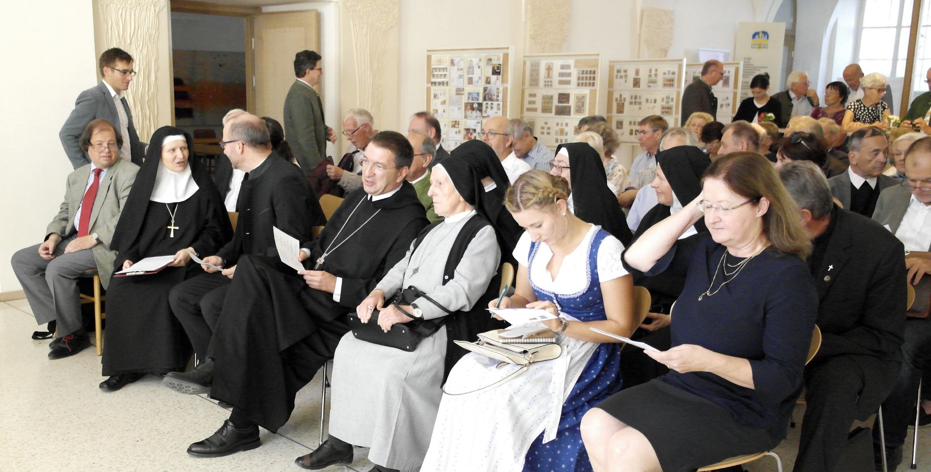 Legende Bild rechts: Mag. Dominik Elmer (Seelsorgeamt Salzburg), Mag. Gerlinde Scholler (Österr. Post AG), Abt Korbinian Birnbacher OSB (Stift St. Peter), Äbtissin Sr. Veronika Kronlachner, Obmann Mag. Wilhelm Remes, Generalvikar Mag. Roland Rasser