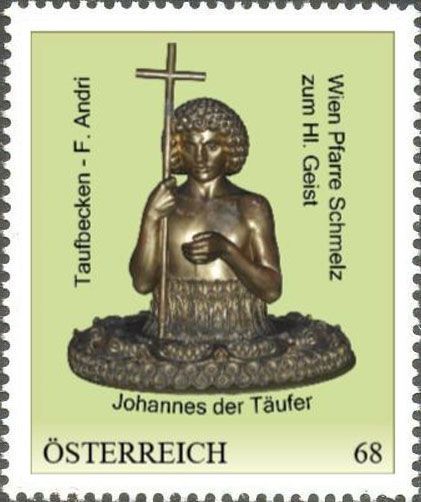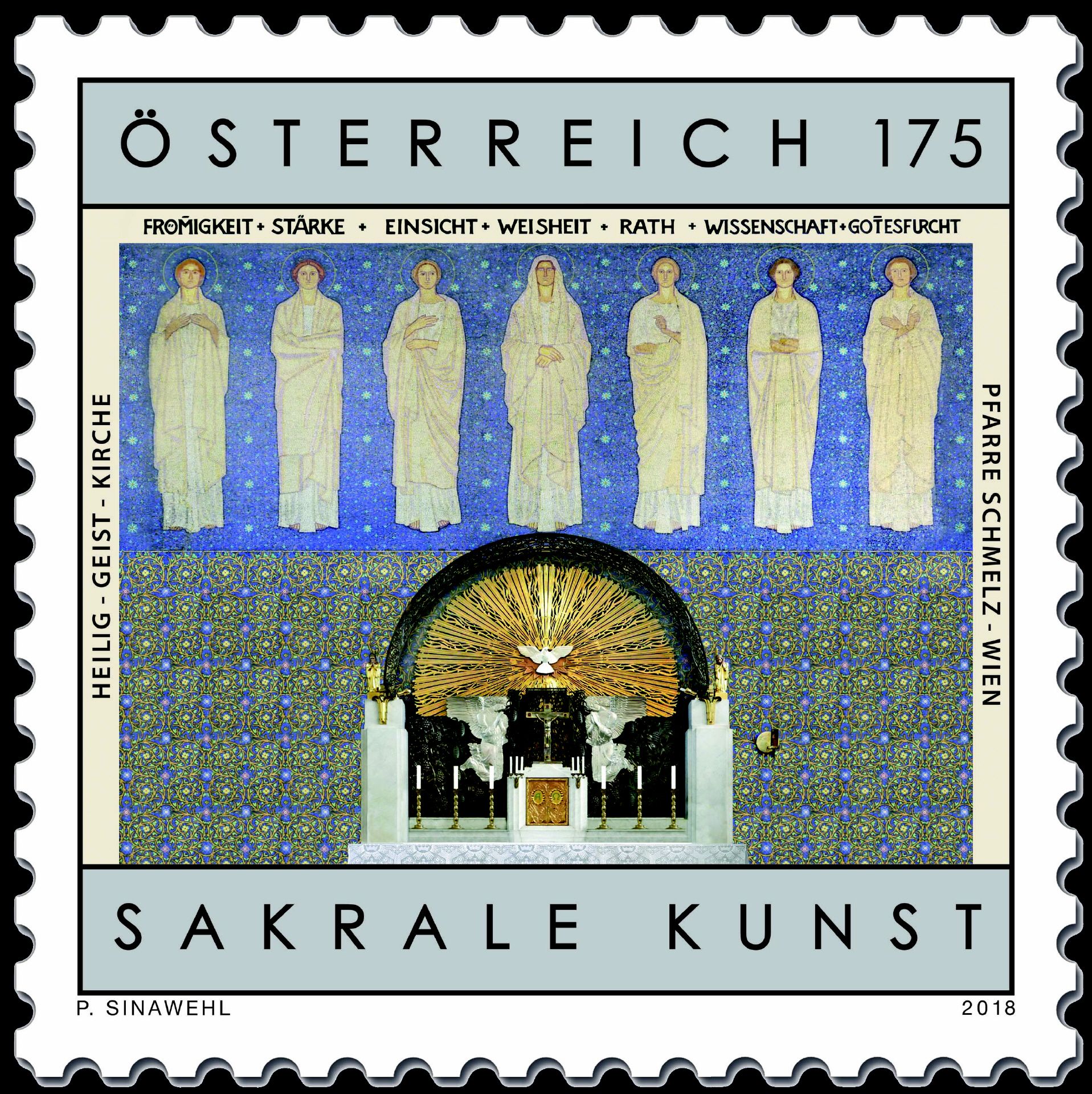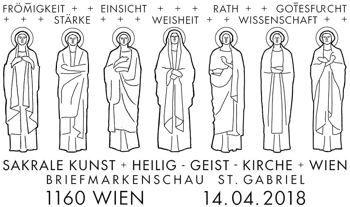 Am 14. April 2018 präsentiert der österreichische Philatelistenverein St. Gabriel in Zusammenarbeit mit der Pfarre Schmelz „Zum Hl. Geist“ und der österreichischen Post AG im Pfarrsaal, Klausgasse 18, 1160 Wien um 15 Uhr eine weitere von Peter Sinawehl gestaltete Sonderbriefmarke der Reihe „Sakrale Kunst“. Passend zum Osterfestkreis bzw. vor Pfingsten zeigt sie mit den „Sieben Gaben des Heiligen Geistes“ eine ikonographische Besonderheit – diese sind allegorisch in Form von sieben Figuren (Frömmigkeit, Stärke, Einsicht, Weisheit, Rat, Wissenschaft und Gottesfurcht) nebeneinander gereiht, geschaffen in Form eines großflächigen Altarwandmosaiks von Ferdinand Andri über dem Hochaltar der Heilig-Geist-Kirche, die – errichtet nach Plänen Jo e Ple niks in den Jahren 1911 bis 1913 - ein sakrales Gesamtkunstwerk des Wiener Jugendstils darstellt. Lernen Sie am 14. April ein wenig bekanntes sakrales Architekturjuwel Wiens kennen und besuchen Sie unsere Veranstaltung! Von 11 bis 17 Uhr amtiert im Pfarrsaal ein Sonderpostamt (+Philatelietag), begleitet von einer Briefmarkenschau. Es werden zwei personalisierte Briefmarken aufgelegt – die erste Marke zeigt die an einen griechischen Tempel erinnernde Fassade der Heilig-Geist-Kirche, die zweite zeigt die hölzerne Figur Johannes des Täufers als Oberteil des Taufbeckens in der Krypta, ein weiteres Werk von F. Andri im secessionistischen Stil.