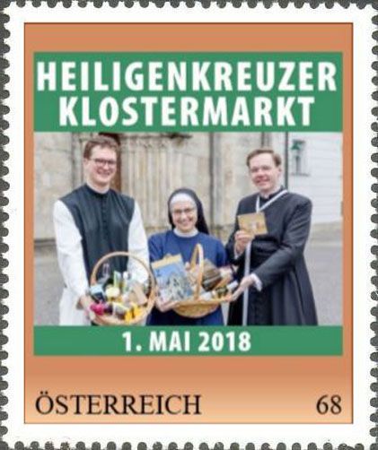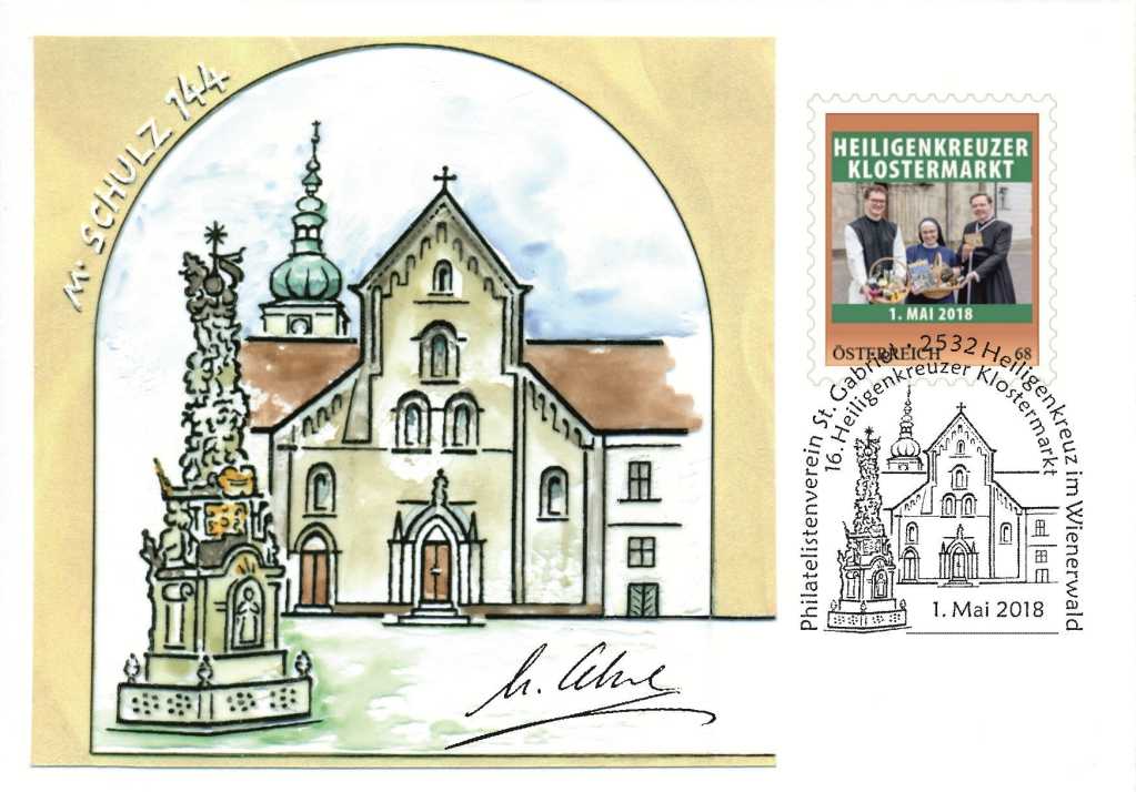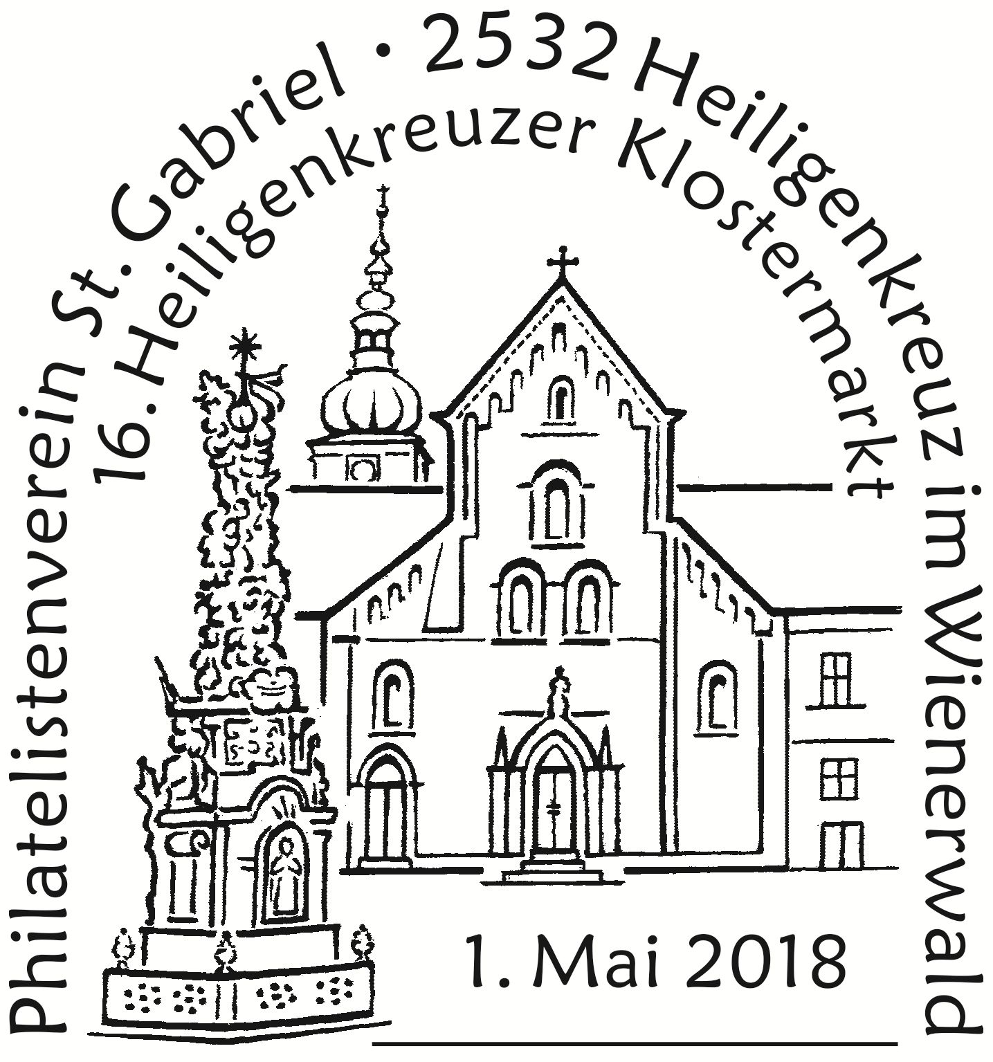 Innerhalb von vier Jahren bietet der jährlich am 1. Mai stattfindende Klostermarkt am Stiftsgelände von Heiligenkreuz der Gilde St. Gabriel nun schon zum dritten Mal Gelegenheit, die mittlerweile größte Zisterzienserabtei Europas philatelistisch zu würdigen. Der alljährlich von tausenden Besuchern frequentierte Klostermarkt bietet Produkte und Erzeugnisse von mehr als 40 Klöstern aus In- und Ausland, umrahmt von zahlreichen festlichen Angeboten. Von 9 bis 16 Uhr finden Sie den Info- und Verkaufsstand der Gilde St. Gabriel bzw. die Österreichische Post AG mit einem Sonderpostamt (+Philatelietag) in der Aula im inneren Stiftshof. GS Maria Schulz hat den Sonderstempel gestaltet: Er zeigt die romanische Westfassade der Klosterkirche v. Heiligenkeuz, die von Giovanni Giuliani geschaffene Dreifaltigkeitssäule sowie im Hintergrund den Turm der Kreuzkirche. GS Maria Schulz wird persönlich anwesend sein und eine Künstlerkarte auflegen.