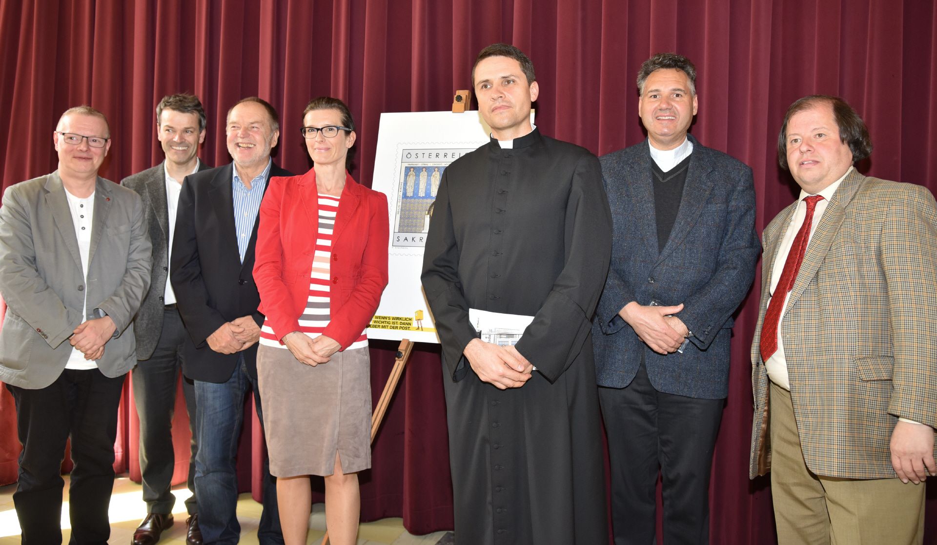 Das offizielle Photo der Präsentation am 14.April 2018 zeigt v.l.n.r.: Bezirksrat Gerhard An-tes, Dr. Alexander Klee (Österr. Galerie Belvedere), GB Peter Sinawehl, Mag. Gerlinde Scholler (Österr. Post AG), Gastgeber P. Christoph Cinal SCJ, Dechant Pfr. Thomas Michael Natek, Mag. Wilhelm Remes (Gilde St. Gabriel) © Photos: Hrncir / Pudek.