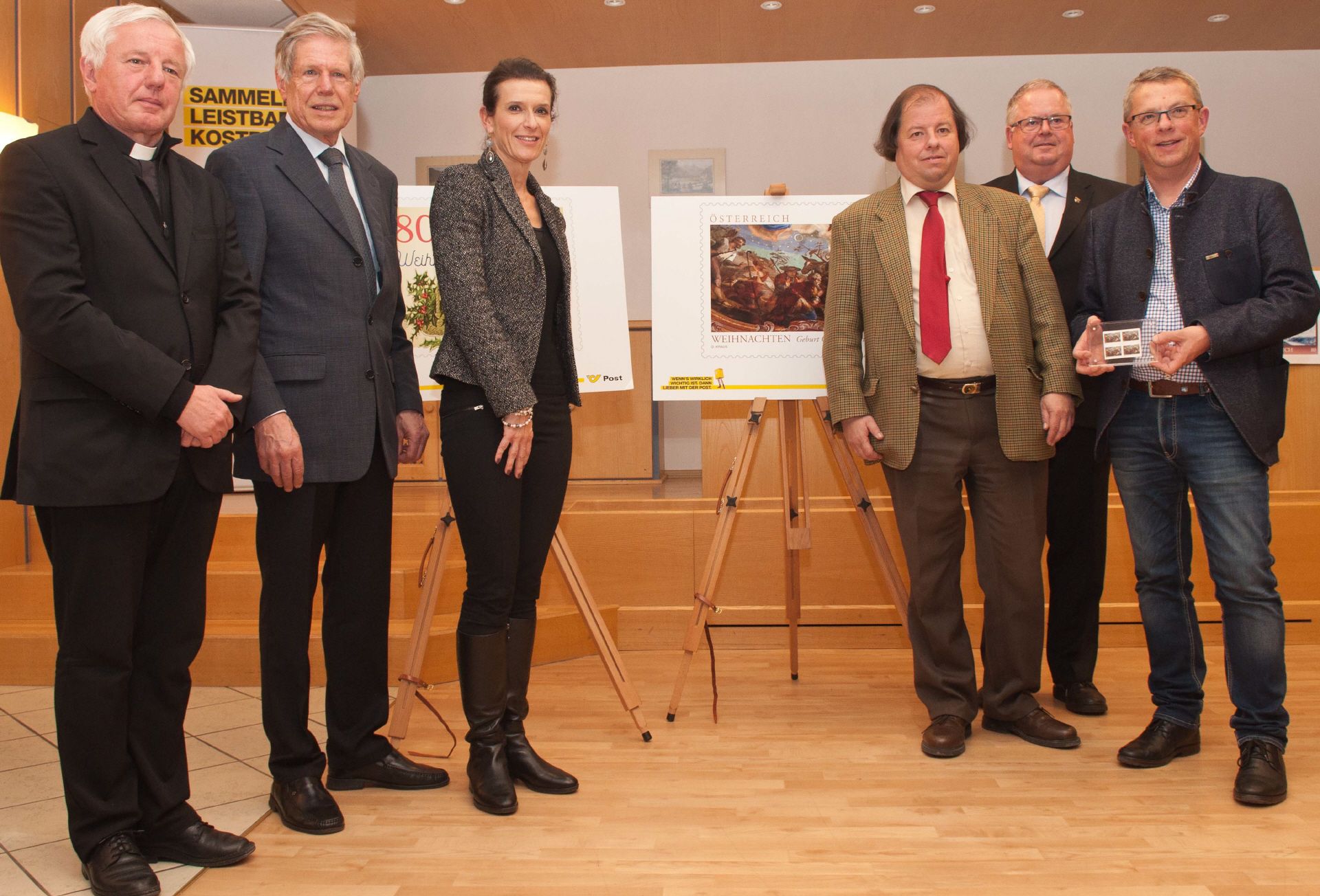 Präsentation der Weihnachtsmarke 2018 mit dem Motiv Christi Geburt aus Maria Rast am Hainzenberg im Gemeindesaal in Zell a. Ziller, 30. Nov. 2018, v.l.n.r.: Dekan Dr. Ignaz Steinwender, Günter Mair (LGW u. Obmann BSV Zillertal), Mag. Gerlinde Scholler (Österreichische Post AG), Mag. Wilhelm Remes (Obmann Gilde St. Gabriel), Bgm. v. Hainzenberg - Georg Wartelsteiner, Bgm. Zell a. Ziller - Robert Pramstrahler © Martin Luxner Fotos