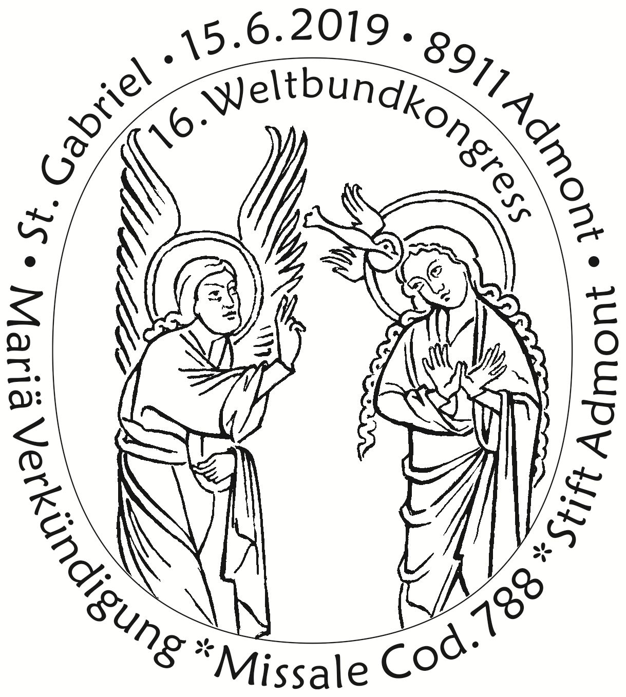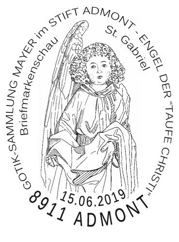 Aufgrund der am 13. Juni beginnenden Weltbundkonferenz der 12 nationalen Gabriel-Gilden kommt am 15. Juni ein zweiter Sonderstempel zum Einsatz. Sein Motiv hat die Verkündigung durch den Erzengel Gabriel zum Thema und wurde von Maria Schulz gestaltet nach Vorlage einer mit Buchmalerei ausgestatteten Pergamentseite des Messbuches Cod. 788 (Missale, Mitte 14. Jh.) - einer weiteren Kostbarkeit aus dem Stift Admont mit seiner weltgrößten Klosterbibliothek.