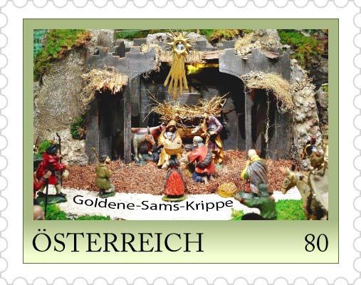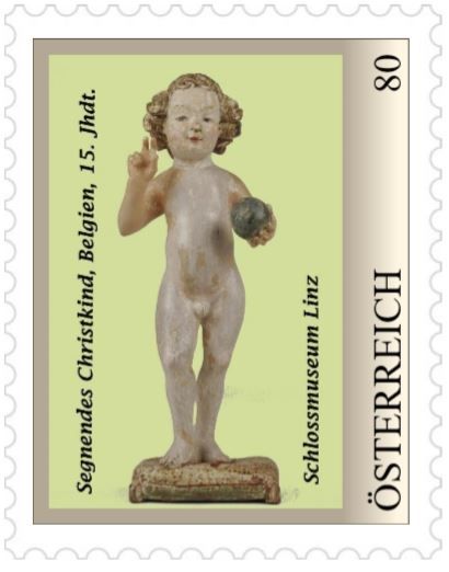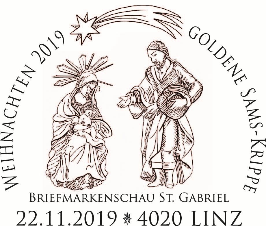 Das einzige Briefmarken-Motiv des Jahres 2019 mit der Weihnachtsbotschaft kommt aus dem Schlossmuseum Linz. Die Figuren Maria, Josef u. Jesuskind entstammen der Goldenen Sams-Krippe, die aus Bad Ischl stammt und im Rahmen der alljährlichen Krippenschau im Schlossmuseum gezeigt wird. Die heurige Sonderschau „Christkinder“ wird von einer Briefmarkenschau mit prominent besetzten Objekten (Günter Muckenhuber – Recobreife der ersten Christkindlsaison 1950/51, Karl Ohnmacht – Weihnachtsmarken und Stempel von Reinhold Stecher, etc…) umrahmt. Beides wird bis 2. Februar 2020 zu sehen sein.