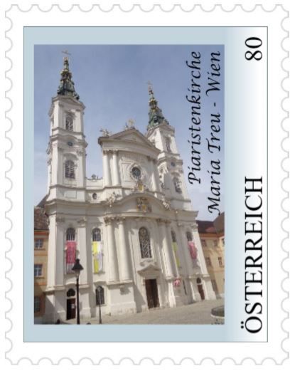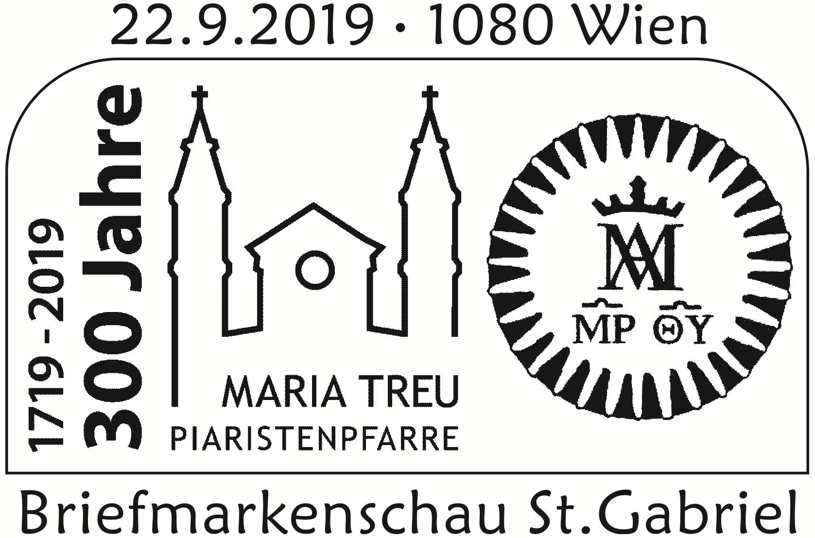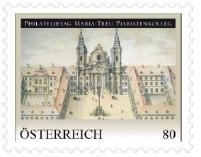 Aus diesem Anlass wird am 22. September 2019 – am Tag des hl. Josef von Calasanz in den Räumlichkeiten der Piaristenpfarre (Piaristengasse 43-46) von 10.30 bis 14.30 Uhr ein Sonderpostamt eingerichtet sowie eine Briefmarkenschau geboten. Zum Einsatz kommt der von Maria Schulz gestaltete Sonderstempel, der neben dem traditionellen Ordenswappen der Piaristen das aktuelle Logo der Piaris-tenpfarre Maria Treu zeigt. Die pers. Briefmarke zeigt die konvex-konkav geschwun-gene hochbarocke Kirchenfassade von Maria Treu, die ab 1716 nach dem Entwurf von Lucas von Hildebrandt errichtet wurde und vor allem wegen der Kuppel (Kilian Ignaz Dientzenhofer) und deren Freskenschmuck (Franz Anton Maulbertsch) ge-rühmt wird. An diesem Tag wird zeitgleich ein Philatelietag abgehalten – die ent-sprechende Marke zeigt die Kirche, Kollegium und Löwenburgisches Konvikt der Piaristen nach den ursprünglichen Plänen (Federzeichnung 1750). Die Veranstal-tung wird vom traditionellen Josefstädter Pfarrkirtag, der bereits am Samstag, dem 21. September - Briefmarkenschau ebenfalls ab 14 Uhr geöffnet - beginnt, und am Sonntag neben einer Festmesse einen Frühschoppen am Jodok-Fink-Platz aufbie-tet.