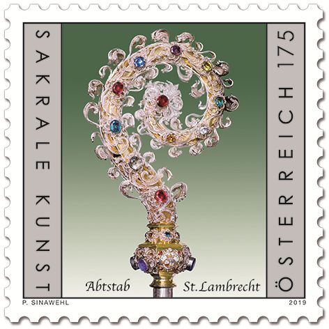 Das philatelistische Belegprogramm widmet sich den überreichen Kunstschätzen der Abtei St. Lambrecht, allen voran der Abtstab, der als Motiv für den 18. Wert der Briefmarkenserie „Sakrale Kunst“ fungiert und als Zeichen des äbtlichen Amtes und der Hirtensorge des Klostervorstehers für seine Gemeinschaft gilt. Dieser Hirtenstab (lat. Pastorale) ist als Augsburger Arbeit aus der Zeit um 1740 einzustufen. Die erste pers. Marke zeigt die Ansicht der imposanten Westfassade des Klosters und der doppeltürmigen Pfarr- und Stiftskirche. Das pers. „Markenpärchen“ zeigt den Hl. Benedikt (mit Mitra, Giftbecher und Schlange) und den Hl. Lambert (mit Lanze) – beides sind Stickereien vom Antependium des „Bilderornates“, 1671 ausgeführt von Fr. Benno Haan, dem „Meister der Nadel“ aus Stift Admont.