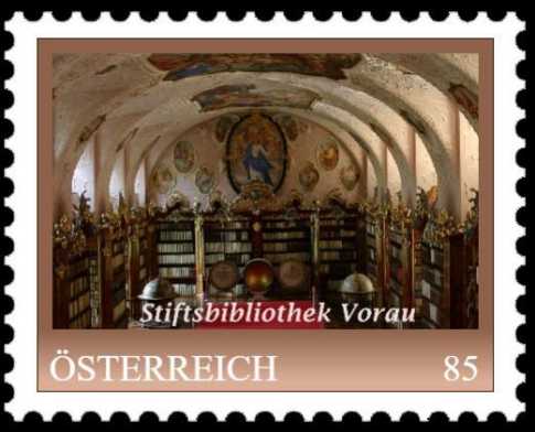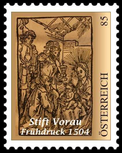 Die Initiale h aus dem Vorauer Riesenantiphonar (Codex 259/1),das 1360/61 im Raum Prag entstanden und 1435 von Propst Pranpeck für das Stift Vorau angekauft worden ist, wird von der figürlichen Darstellung der Geburt Christi geziert, die auch als Vorlage für die aktuelle Weihnachtsmarke mit christlichem Motiv dient. Aus diesem Anlass legt die Gilde St. Gabriel zwei personalisierte Briefmarken auf. Die erste zeigt die im 18. Jahrhundert prächtig im barocken Stil ausgestattete Vorauer Stiftsbibliothek. Die zweite zeigt mit dem Frühdruck aus dem Jahr 1504 die Anbetung der hl. Drei Könige und somit einen weiteren Schatz der Stiftsbibliothek.