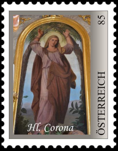 Auch der österreichische Philatelistenverein St. Gabriel legt nach diversen Anfragen ab sofort eine personalisierte Briefmarke mit dem Motiv der hl. Corona auf – Abbildung siehe Titelseite (Kosten je 3 €, mit Kuvert 4 €). Es zeigt ein Altarbild mit der hl. Corona, deren Hände an zwei Palmen gefesselt sind, welches sich im niederösterreichischen St. Corona am Schöpfel/Wienerwald befindet. Das Photo hat uns freundlicherweise GB P. Dr. Karl H. Salesny SDB zur Verfügung gestellt! Bestellungen sind an Hans Soriat, Am Golfplatz 16, 5310 Mondsee bzw, an bestellungen@st-gabriel.at zu richten!