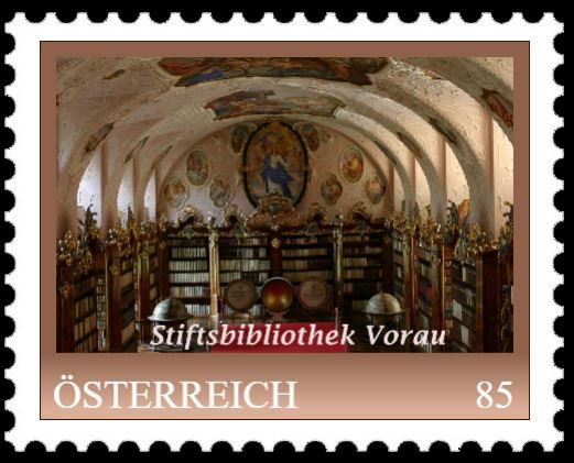 Die Initiale h aus dem Vorauer Riesenantiphonar (Codex 259/1),das 1360/61 im Raum Prag entstanden und 1435 von Propst Pranpeck für das Stift Vorau angekauft worden ist, wird von der figürlichen Darstellung der Geburt Christi geziert, die auch als Vorlage für die aktuelle Weihnachtsmarke mit christlichem Motiv dient. Aus diesem Anlass legt die Gilde St. Gabriel zwei personalisierte Briefmarken auf. Die erste zeigt die im 18. Jahrhundert prächtig im barocken Stil ausgestattete Vorauer Stiftsbibliothek. Die zweite zeigt mit dem Frühdruck aus dem Jahr 1504 die Anbetung der hl. Drei Könige und somit einen weiteren Schatz der Stiftsbibliothek.