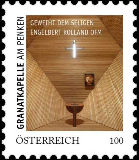 Die personalisierten Marken, die anlässlich des Ersttages am 16. Juli aufgelegt werden, zeigen das Bildnis des sel. Engelbert Kolland im Inneren, den Innenraum der Granatkapelle sowie eine Außenansicht des Geländes mit der Granatkapelle.
