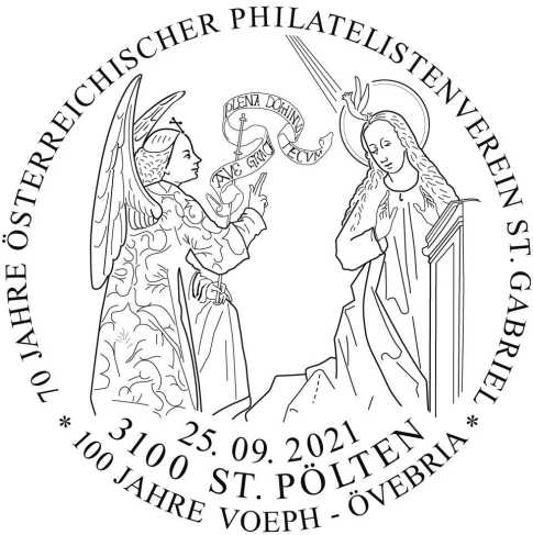 Aus diesem Anlass nimmt die Gilde St. Gabriel an der philatelistischen Großveranstaltung anlässlich des 100-jährigen Bestehens des VÖPh in St. Pölten teil (24.-26. September 2021) und legt einen ME 3 (Marken-Edition 3 mit den Motiven Mariä Verkündigung, Hl. Andreas, Christi Geburt) und einen von Peter Sinawehl gestalteten Sonderstempel mit dem Motiv Mariä Verkündigung auf. Die Motive entstammen dem Andreasaltar, der um 1470 vom nordungarischen Meister Hans Siebenbürger geschaffen wurde und sich einst in der 1786 abgebrochenen Andreaskapelle am Friedhof an der Stiftskirche (heute Domplatz / St. Pölten) befand. 1997 gelangte der Altar in den Besitz der Diözese St. Pölten und zählt seitdem zum Bestand des Museums am Dom in St. Pölten.