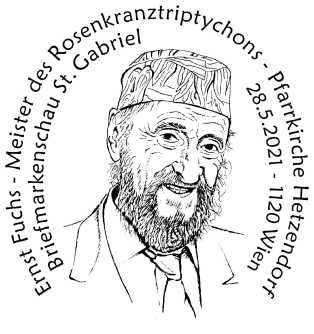 Am 28. Mai 2021 wurde nun das für Mai 2020 anlässlich der Langen Nacht der Kirchen vorgesehene Sonderpostamt im Pfarrsaal nahe der Rosenkranzkirche (Pfarre Wien-Hetzendorf) durchgeführt. Das Motiv des Sonderstempels zeigte ein Porträt des 2015 verstorebenen Meisters Ernst Fuchs, der für die Pfarrkirche Hetzendorf das Rosenkranztriptychon geschaffen hatte. Leider war an diesem Abend das Sonderpostamt das einzige zugängliche Programmelement der für diesen Abend geplanten Langen Nacht der Kirchen, da sich die Pfarre drei Wochen zuvor entschieden hatte, die Kirche zu sperren und die Darbietungen in der Kirche nur virtuell mit Video-Streaming stattfinden zu lassen. Dennoch besuchten uns viele unserer Gildemitglieder, darunter auch GS Maria Schulz, deren für dieses Postamt erstellte Sonderstempel sich als der Letzte ihrer graphischen Laufbahn erweisen sollte.