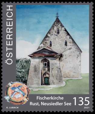 Freitag, 4. Juni 2021, Pfarre Rust, Rathausplatz 16, 7071 Rust, Ersttag der Sondermarke „Fischerkirche Rust“ v. Kirsten Lubach: Sonderpostamt geöffnet von 11 bis 17 Uhr; Präsentation um 16 Uhr (Anmeldung erbeten bei heinz.peroutka@aon.at bzw. 01 9148950). Führungen in der Fischerkirche werden für Kleingruppen ab 14 Uhr möglich sein. Die PBM zeigt ein Aquarell von Friedrich Loos mit der Ansicht des Ruster Kirchenensembles um 1822.