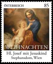 Die erste Weihnachtsmarke zeigt eine seltene Darstellung des jugendlichen Josef mit dem Jesuskind in seinen Armen nach einem Bild von Anton Schoonjans, um 1700, das sich am Josefaltar im Stephansdom befindet.