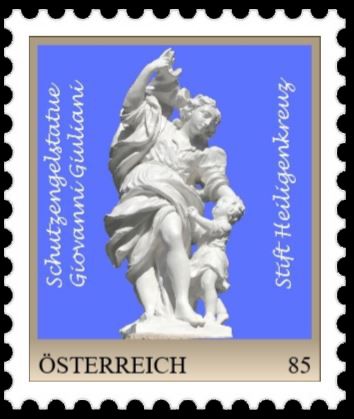 Samstag, 15. Mai 2021, Stift Heiligenkreuz (PLZ: 2532), Pilgeraula (im Stifts-Innenhof): Sonderpostamt von 12 bis 16 Uhr geöffnet, Anlass: 300+1 Jahre Schutzengelstatue, Sonderstempel v. Maria Schulz und PBM (personalisierte Marke) zeigen den Schutzengel nahe Stift Heiligenkreuz (Badener Straße).
