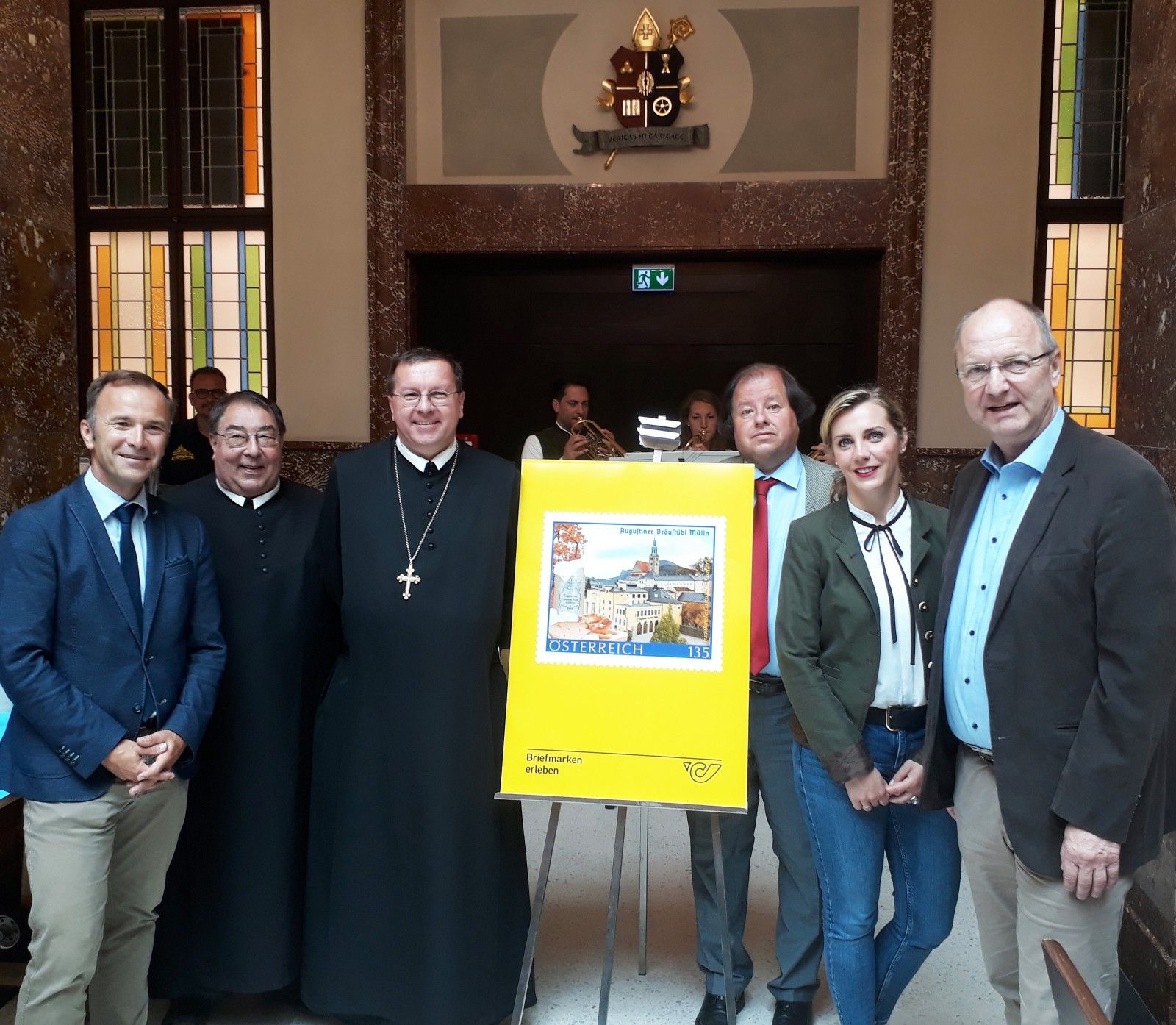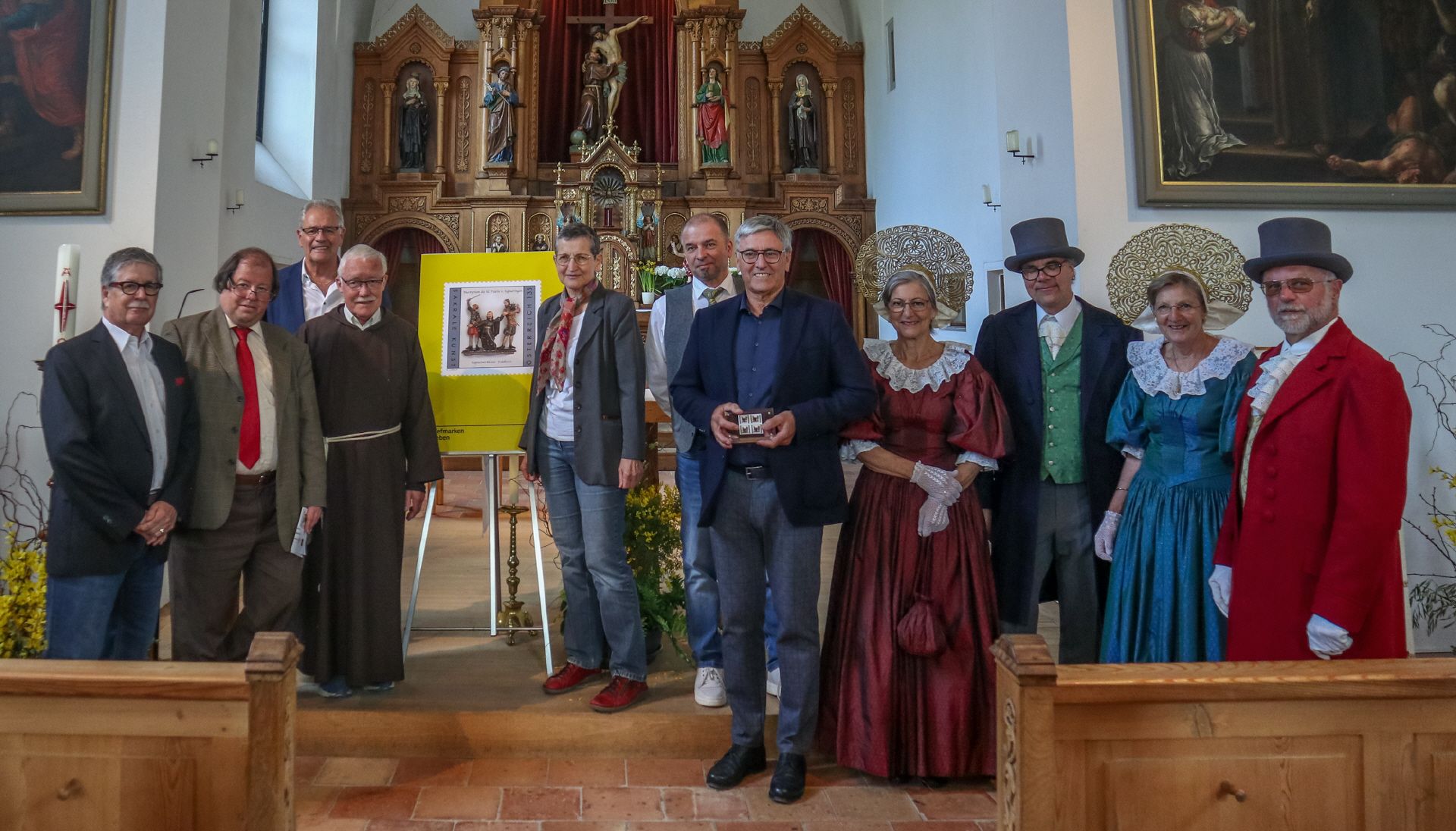 Präsentation der neuen Sondermarke am 22. April 2022: Harald Staffler (VÖPh-Regio West, Club Montfort), Obmann Mag. Wilhelm Remes (Gilde St. Gabriel), Bundesrat a. D. Edgar Mayer, Quardian Br. Karl-Martin Gort, LR a. D. Dr. Greti Schmid (Präs. Freundeskreis der Kapuziner), Hr. Schwaiger (Österr. Post AG), Wolfgang Matt (Bürgermeister v. Feldkirch), Feldkircher Trachtengruppe