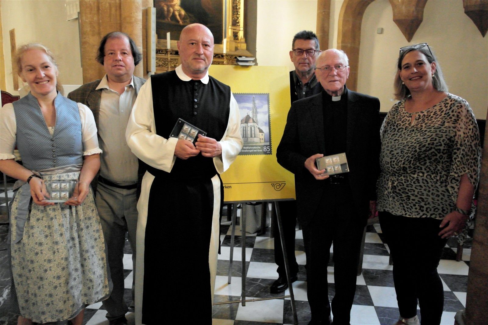 Präsentation in der ehem. Stiftskirche vor dem Fastentuch: Elisabeth Plank, Bürgermeister Alexander Thoma MBA, Pfarrer Slawomir Czulak SCJ, Obmann Mag. Wilhelm Remes