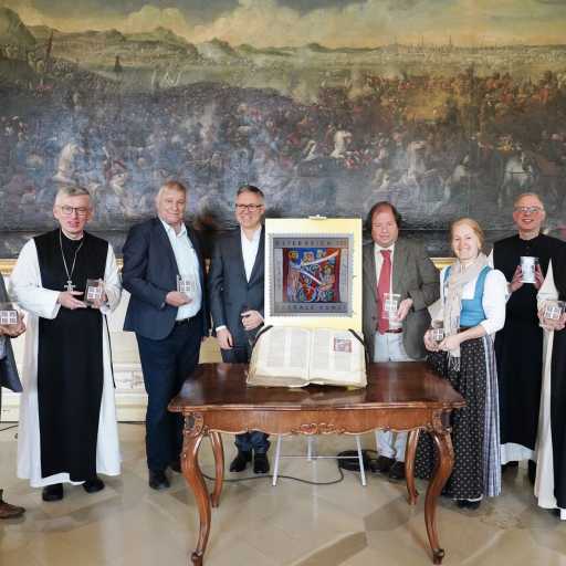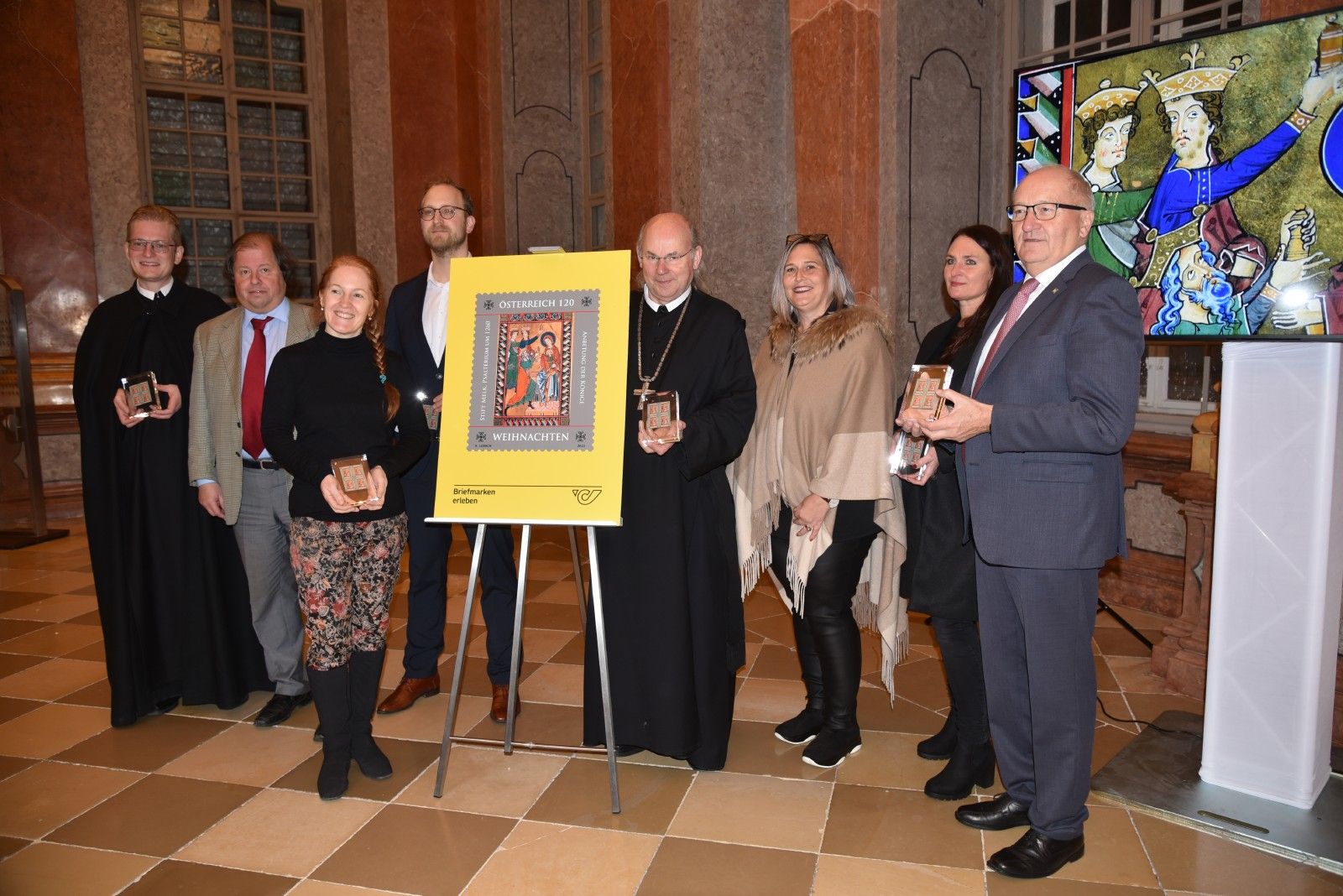 Präsentation der Weihnachtssondermarke „Anbetung der Könige“ am 18. November 2022 im Marmorsaal des Stiftes Melk: v.l.: Mag. P. Ludwig Wenzl OSB, Mag. Wilhelm Remes (Obmann Gilde St. Gabriel), Kirsten Lubach (Gestalterin der Sondermarke), Dr. Johannes Deibl (Stiftsbibliothekar), Abt Georg Wilfinger OSB, Martina Prinz (Leitung Verkauf Philatelie, Österreichische Post AG), Mag.a Bernadette Kalteis, Karl Moser (Zweiter Präsident des NÖ. Landtages) © Hrncir