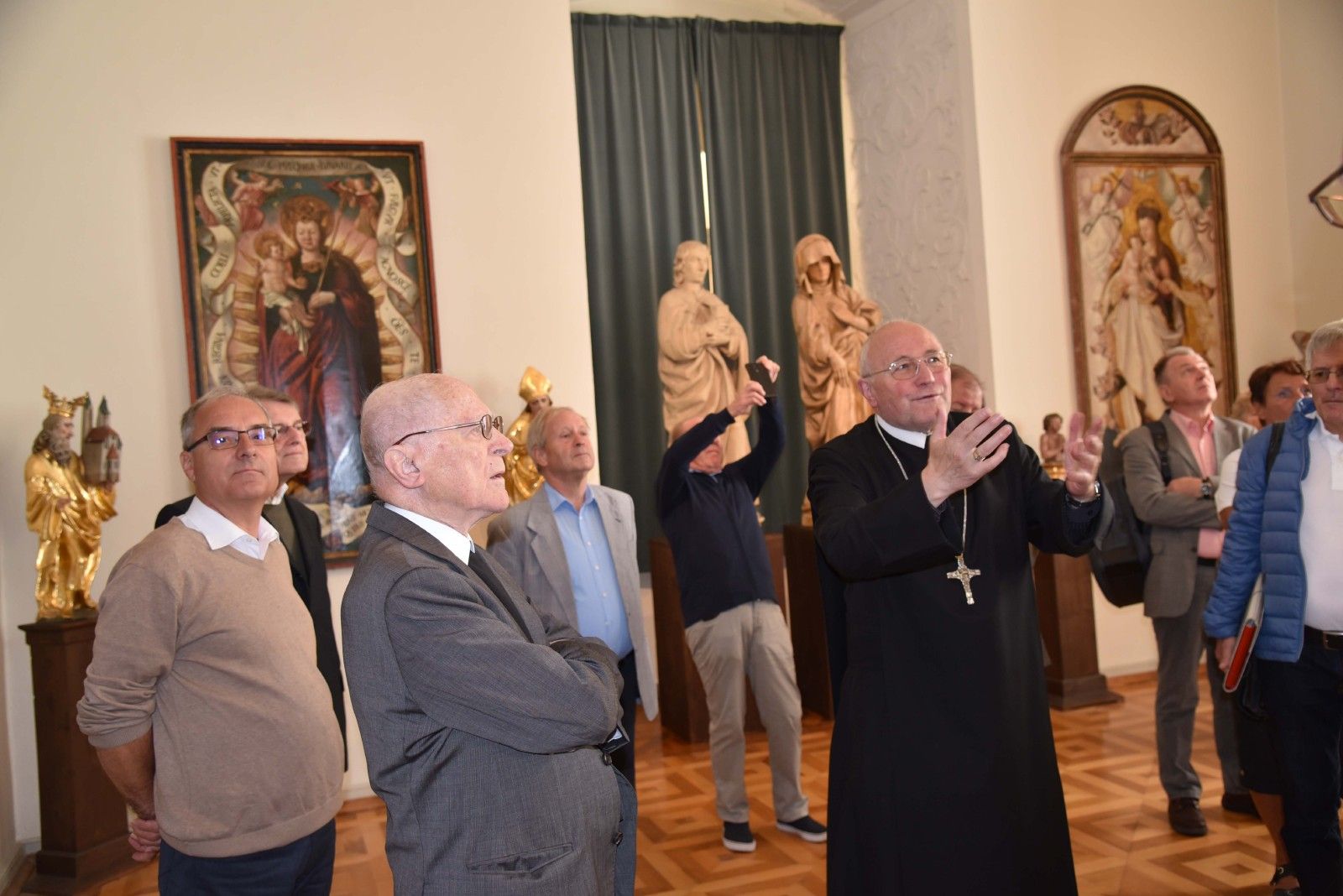 [Bild links unten] DI Kuno Mayer mit den „Gabis“ vor dem Objekt der Briefmarke in „seiner“ Gotik-Sammlung, Stiftsmuseum Admont.