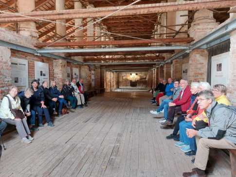 Von 15. – 21. Oktober führte die gelungene Gildereise 2023 nach Montegrotto in Venetien am Fuße der Euganeischen Hügel, um unter der meisterhaften und erfahrenen Führung unseres GB Dr. Wilhelm Deuer Kulturausflüge in die nähere Umgebung zu unternehmen als auch der körperlichen Wellness in den reichlichen Badeanlagen in unserem Hotel Bellavista Zeit und Raum zu geben, was von den 23 Teilnehmern sehr genossen wurde. Heuer durften wir auch wieder einige Gäste begrüßen, die sich auf die Gildereise mit uns begaben. Bereits am Anreisetag – der sowohl von Wien mit der Bahn als auch von Salzburg mit dem Bus der Fa. Neubauer via Villach problemlos verlief – tauchten wir mit dem Besuch von Padova (Santo, Palazzo della Ragione) in das italienische Leben und Flair ein. Das Programm führte in pittoreske Orte der Umgebung (Este, Monselice, Montagnana mit seinen Stadtmauern, Arqua Petrarca), als auch mit dem Besuch von Ferrara und der von Kanälen durchsäumten Fischer-Stadt Comacchio in die benachbarte Emilia Romagna. Besonders hervorzuheben ist der Besuch des Parco Valsanzibio, ein Meisterwerk barocker Gartenbaukunst Venetiens und von Vicenza mit den zahlreichen Bauten Palladios und dem vielgerühmten Teatro Olimpico, gefolgt von den Palladio Villen am Monte Berico (Villa Valmarana u. Rotonda) und in Fanzolo bei Treviso (Villa Emo), jeweils mit prachtvollen Fresken mit Genreszenen bzw. Motiven der antiken Götterwelt. Letztgenannter Stadt widmeten wir eine ausführliche Besichtigung, die mit ihren zahlreichen Kanälen und einer quirligen Innenstadt und bemerkenswerten Kirchenausstattungen beeindruckte. Nicht unerwähnt dürfen die beiden verträumten Abteien Santa Maria delle Carceri bei Este und Sesto al Rhegeno (bereits knapp in Friaul) bleiben, die jede auf ihre Weise unerwartete Kunst- und Raumeindrücke preisgaben.